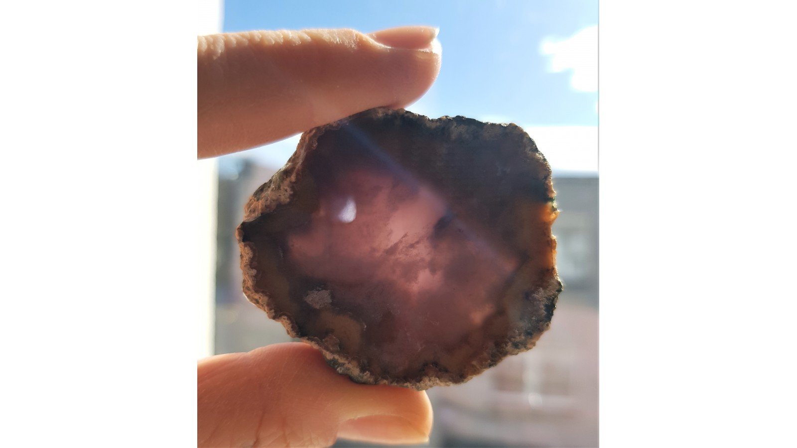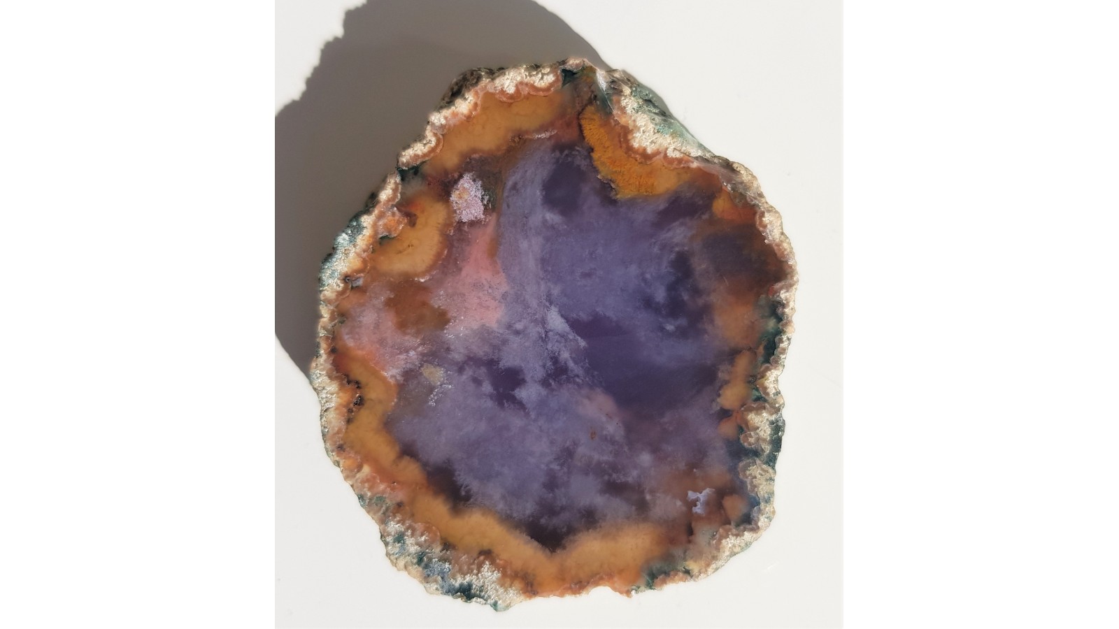 Przeświecający agat w barwach od żółcieni do fioletu, idealny, niespękany, lokalizacja nieznana, zapewne Maroko. Nadaje się perfekcyjnie do wykonania biżuterii z piękną wstawką agatową. Doskonały poler, strona przeciwna naturalna, bez cięcia, regularna. Wyjątkowo estetyczny okaz i surowiec.