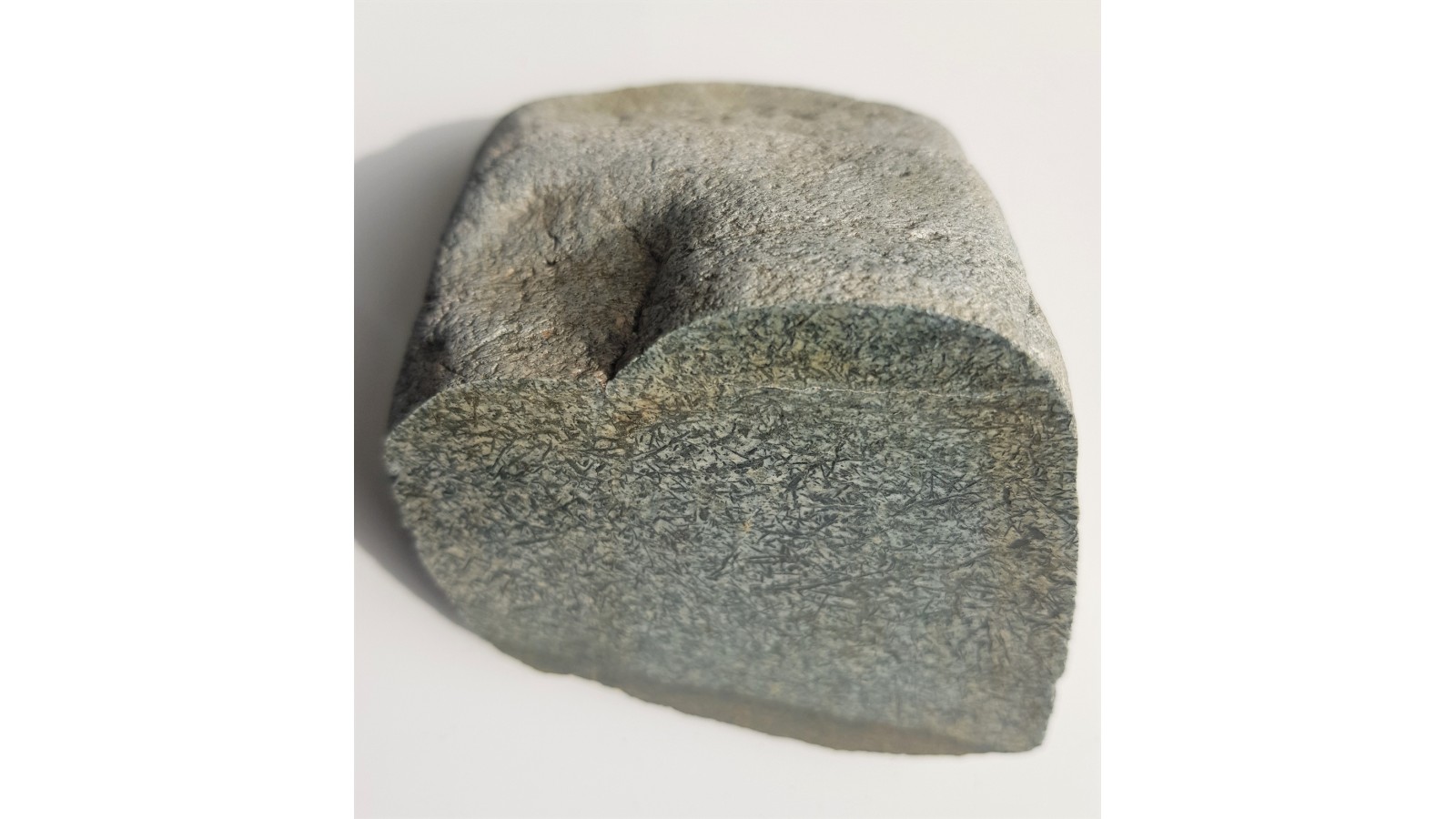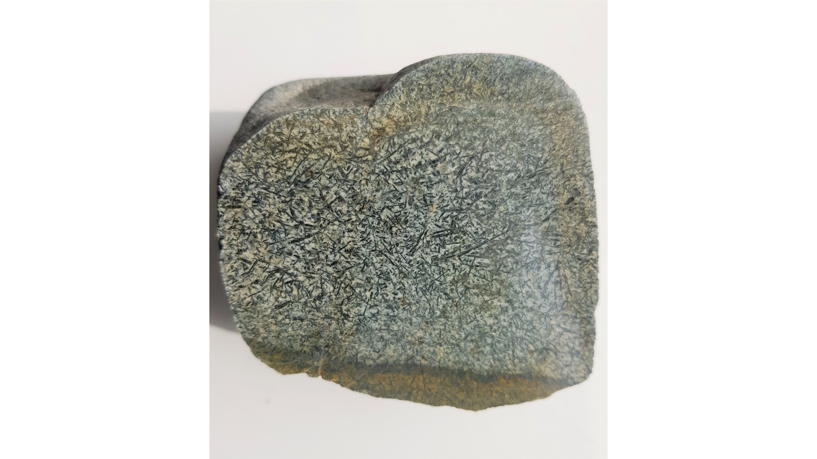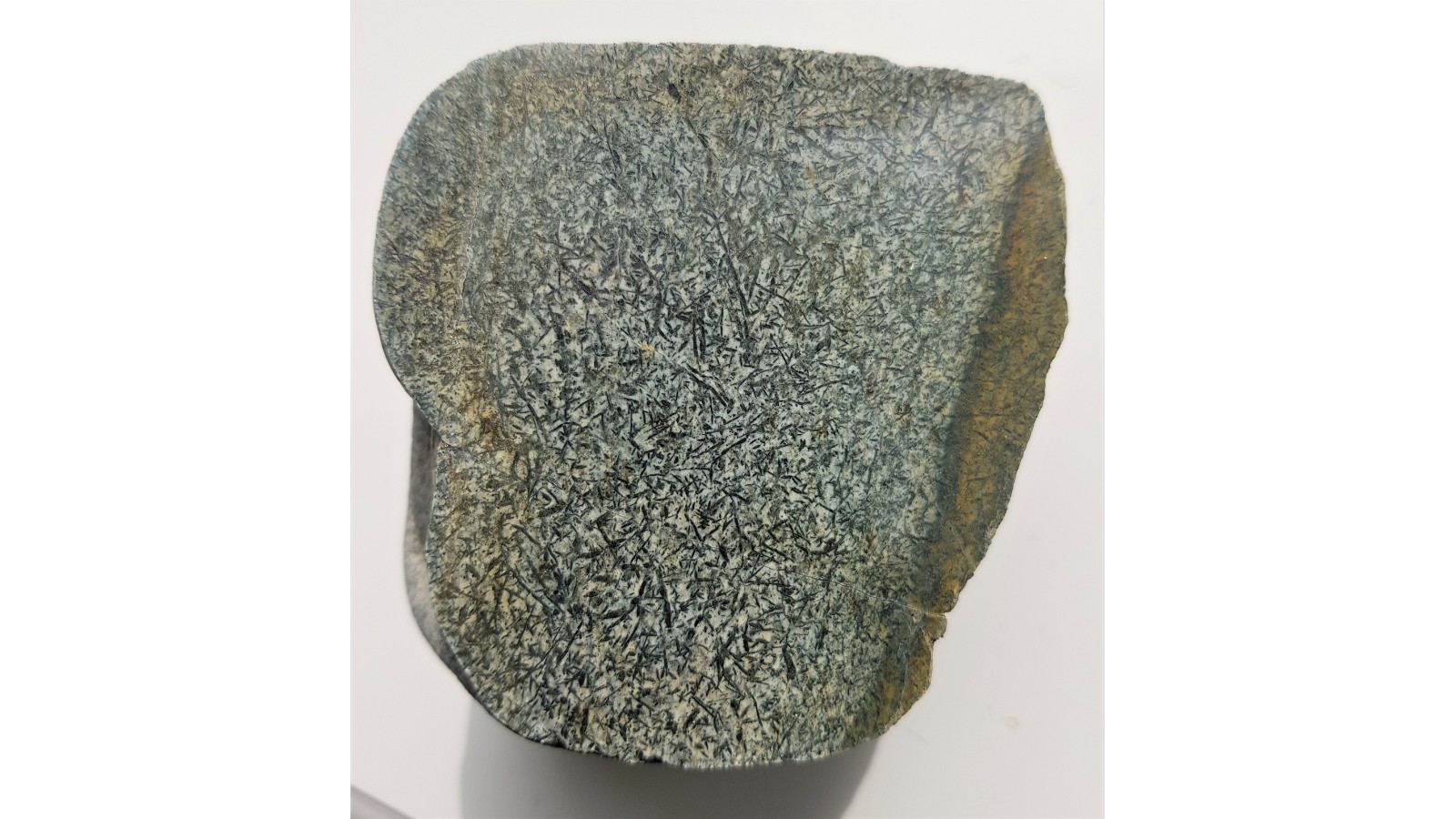 Polerowany okaz niezwykle wyrazistej skały amfibolowo-plagioklazowej z Pilc (aluwia Nysy Kłodzkiej). W jasnym plagioklazowym tle widoczne są kontrastowo odróżniające się, doskonale wykształcone igiełkowe kryształy ciemnozielonych amfiboli. Skała może być określona jako amfibolit, lecz ma teksturę masywną, bez widocznych tekstur planarnych. Okaz jednostronnie polerowany, strona przeciwna to naturalny otoczak. Bardzo ozdobna, kontrastowa i niespękana, masywna skała.