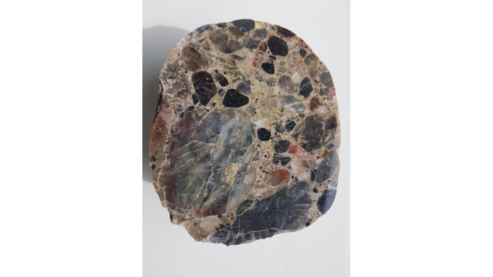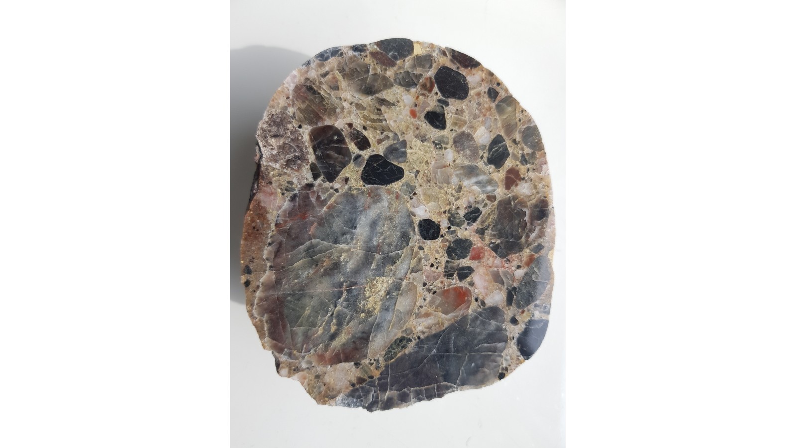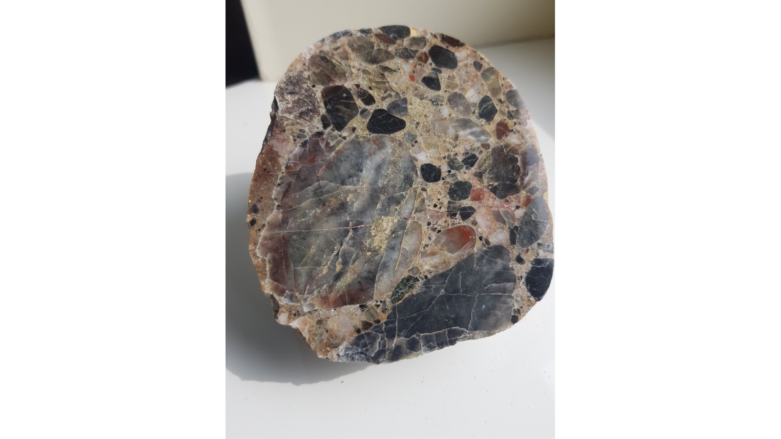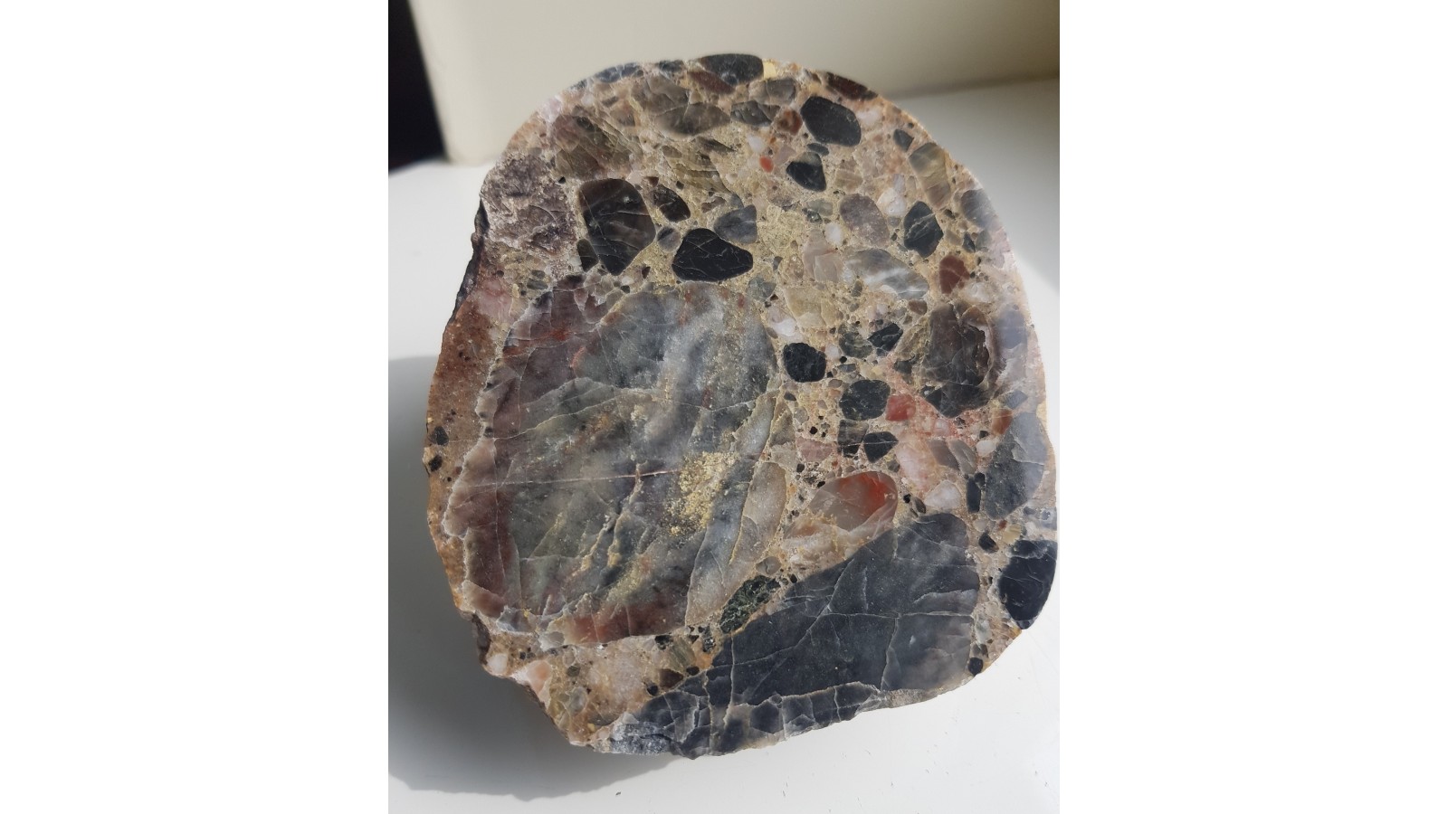 Okaz wyjątkowo ozdobnego, kontrastowo zabarwionego zlepieńca kwarcowego z Pilc z aluwiów Nysy Kłodzkiej. Zarówno klasty jak i spoiwo zlepieńca są kwarcowe. Zróżnicowane barwy klastów, wyjątkowo ozdobny efekt. Doskonały poler, strona przeciwna to naturalny otoczak. Polecam.