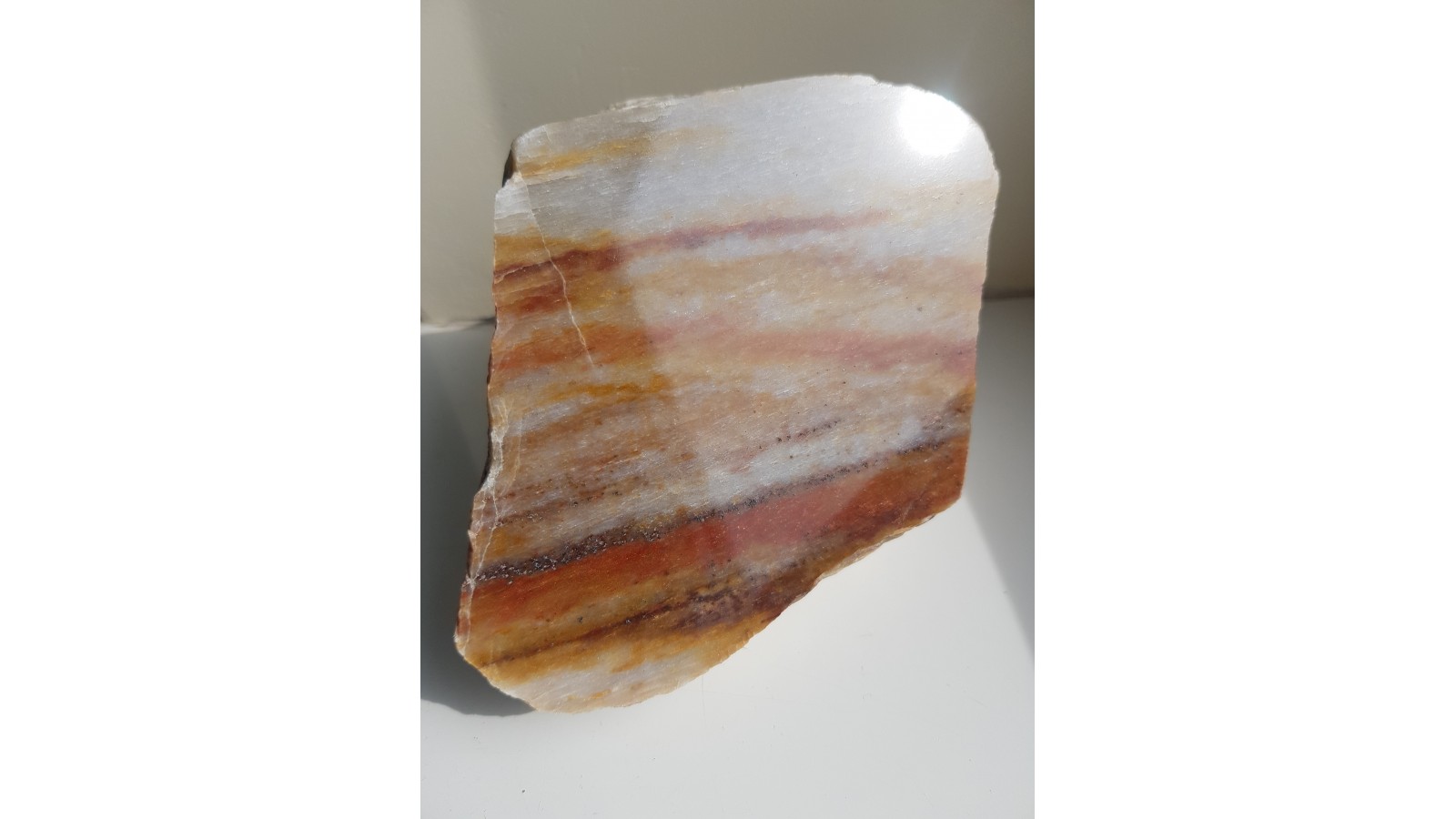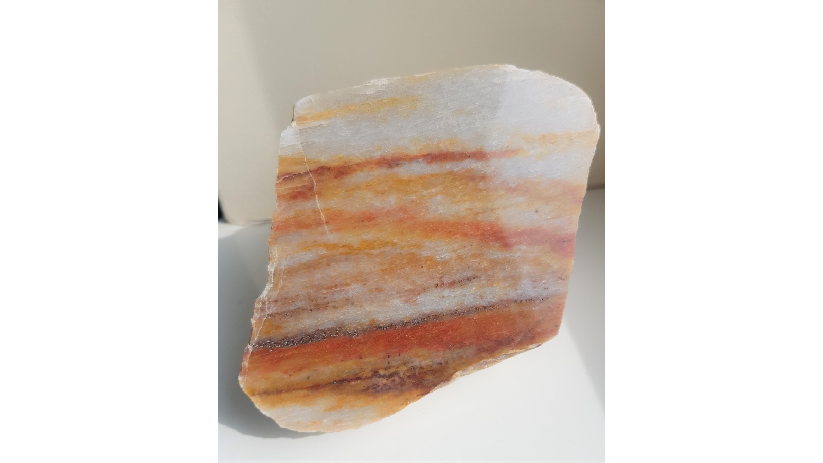 Pięknie warstwowany kwarcyt awenturynowy z Jegłowej o bardzo żywych barwach oraz lokalnie z efektem awenturynu (w strefach barwnych). Bardzo ozdobna, lita skała i rzadko występujący surowiec. Strona przeciwna naturalna, duży, efektowny okaz, polecam.
