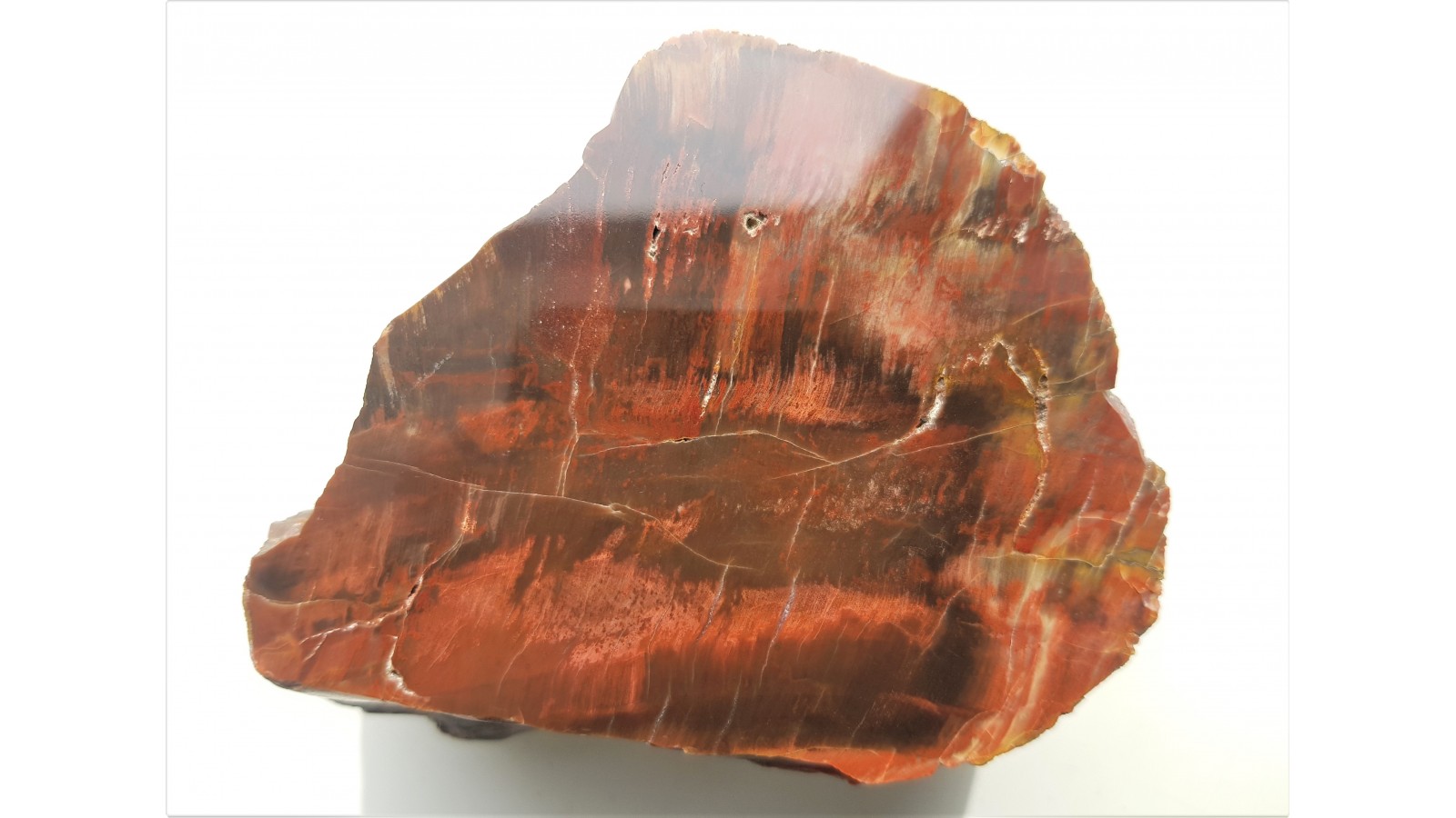 Wyjątkowe, czerwone drewno skrzemieniałe z aluwiów Nysy Kłodzkiej z okolic Kamieńca Ząbkowickiego. Zachowana bardzo wyraziście budowa drewna. Strona przeciwna naturalna, nie cięta. Polecam.
