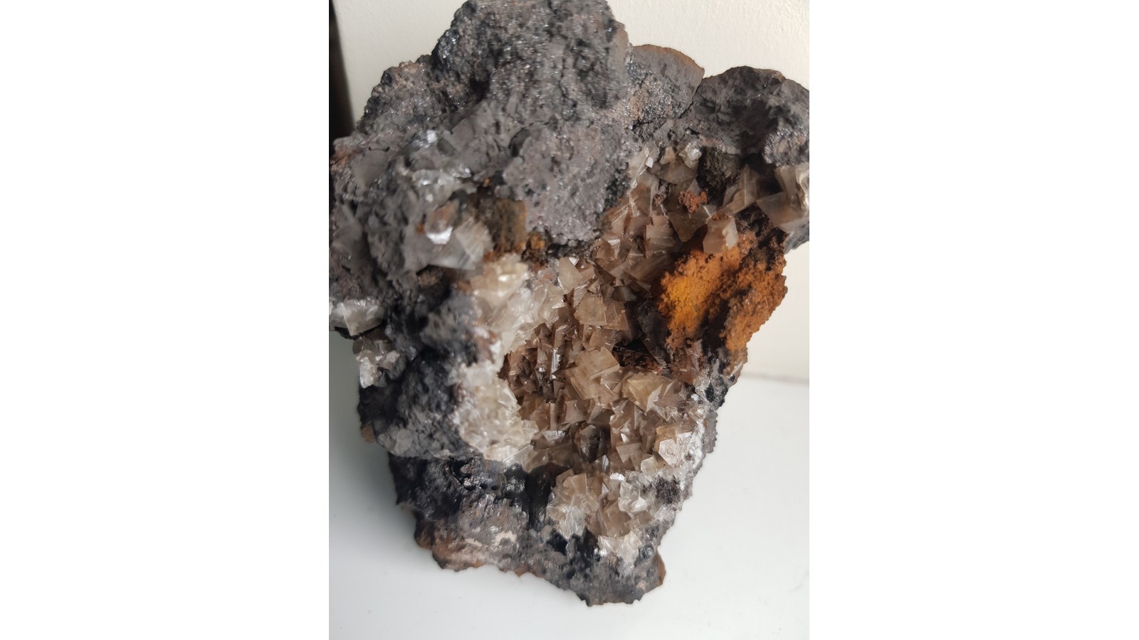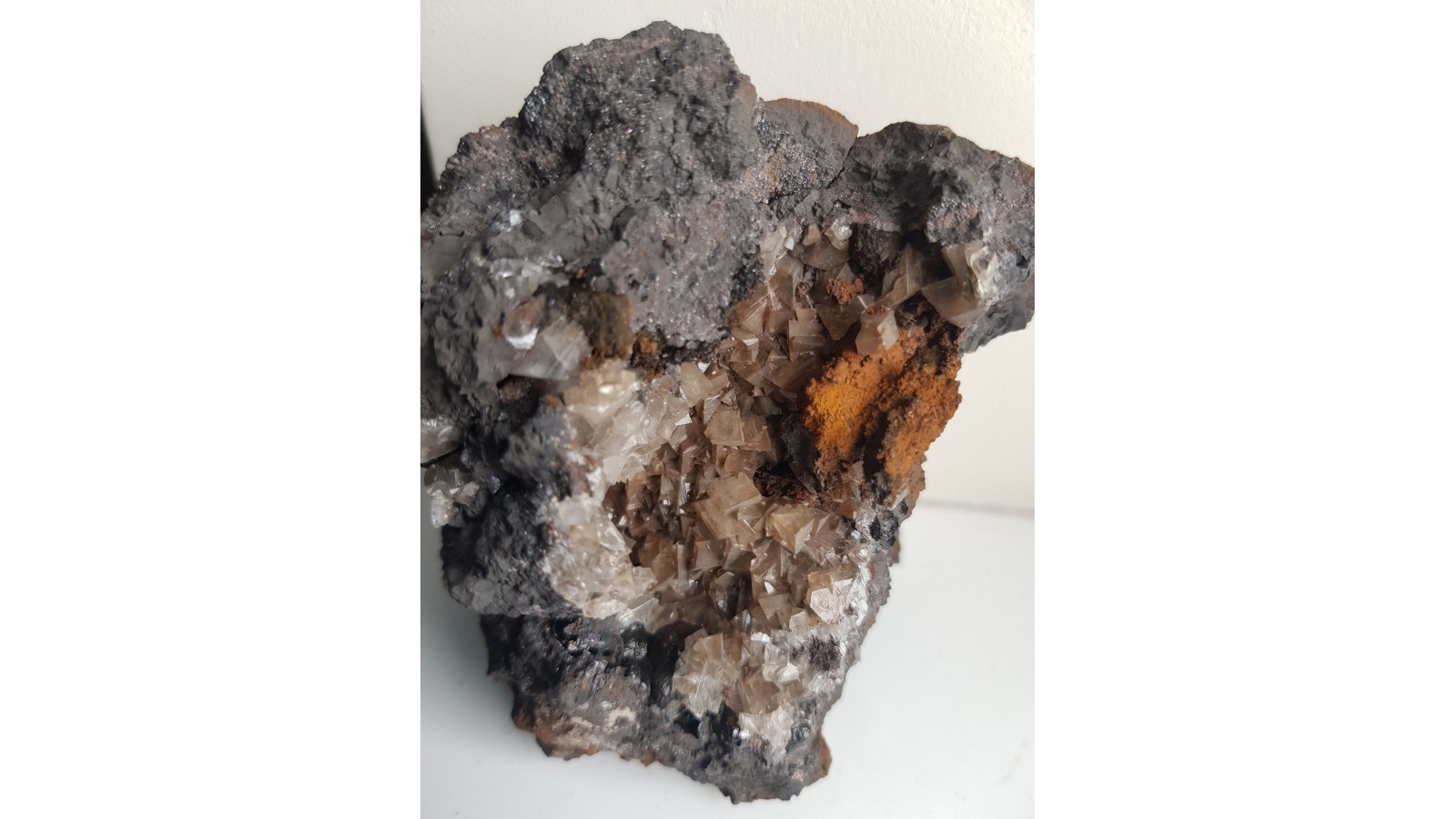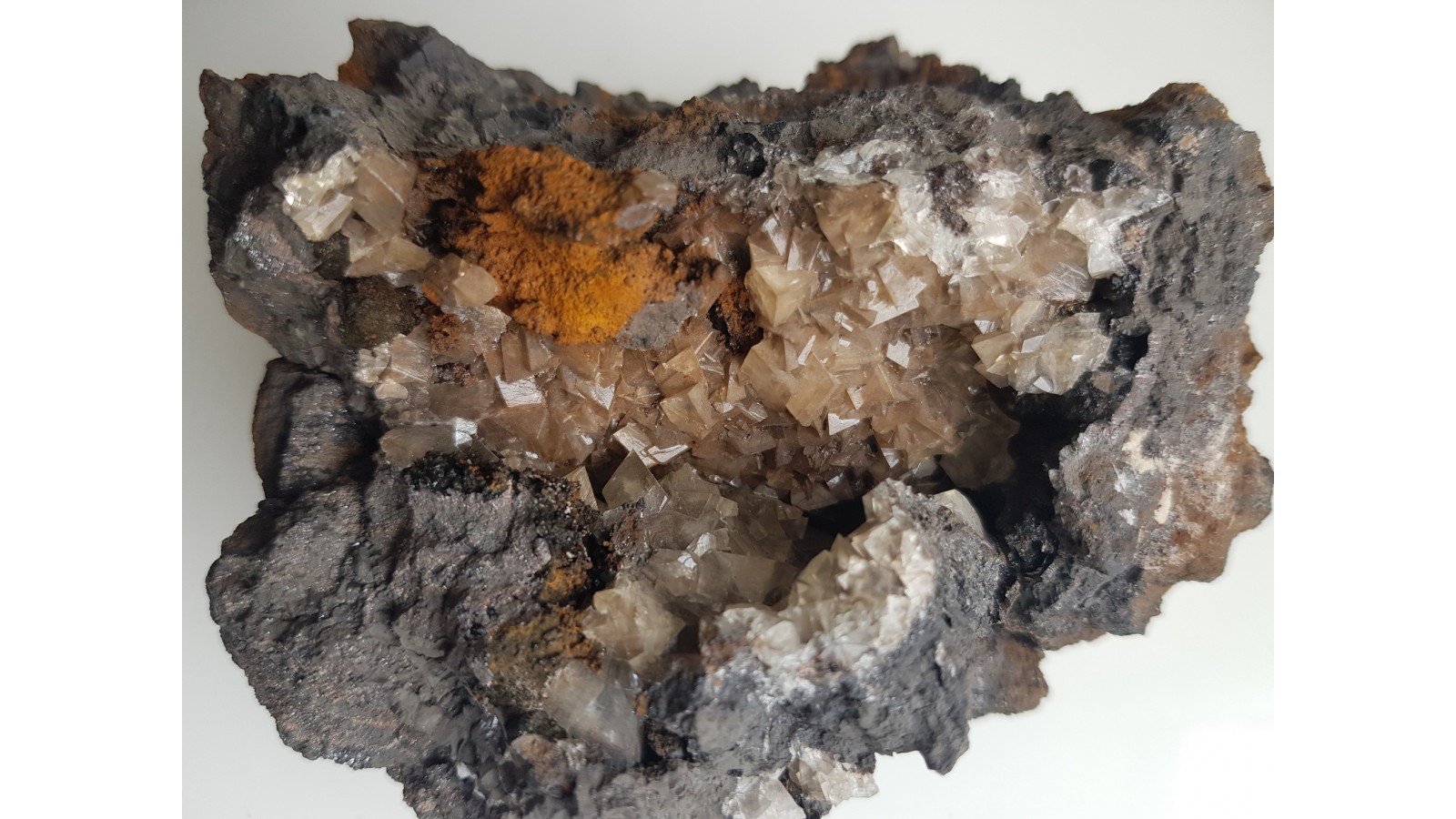 Druza przezroczystych, idealnie wykształconych romboedrów kalcytu w pustce w hematycie z kopalni Wilcza k. Stanisławowa w Górach Kaczawskich. Jest to jedyny znany mi okaz kalcytu tej klasy ze złoża w Wilczej. Absolutny unikat. Idealna druza bez uszkodzeń. Polecam.
