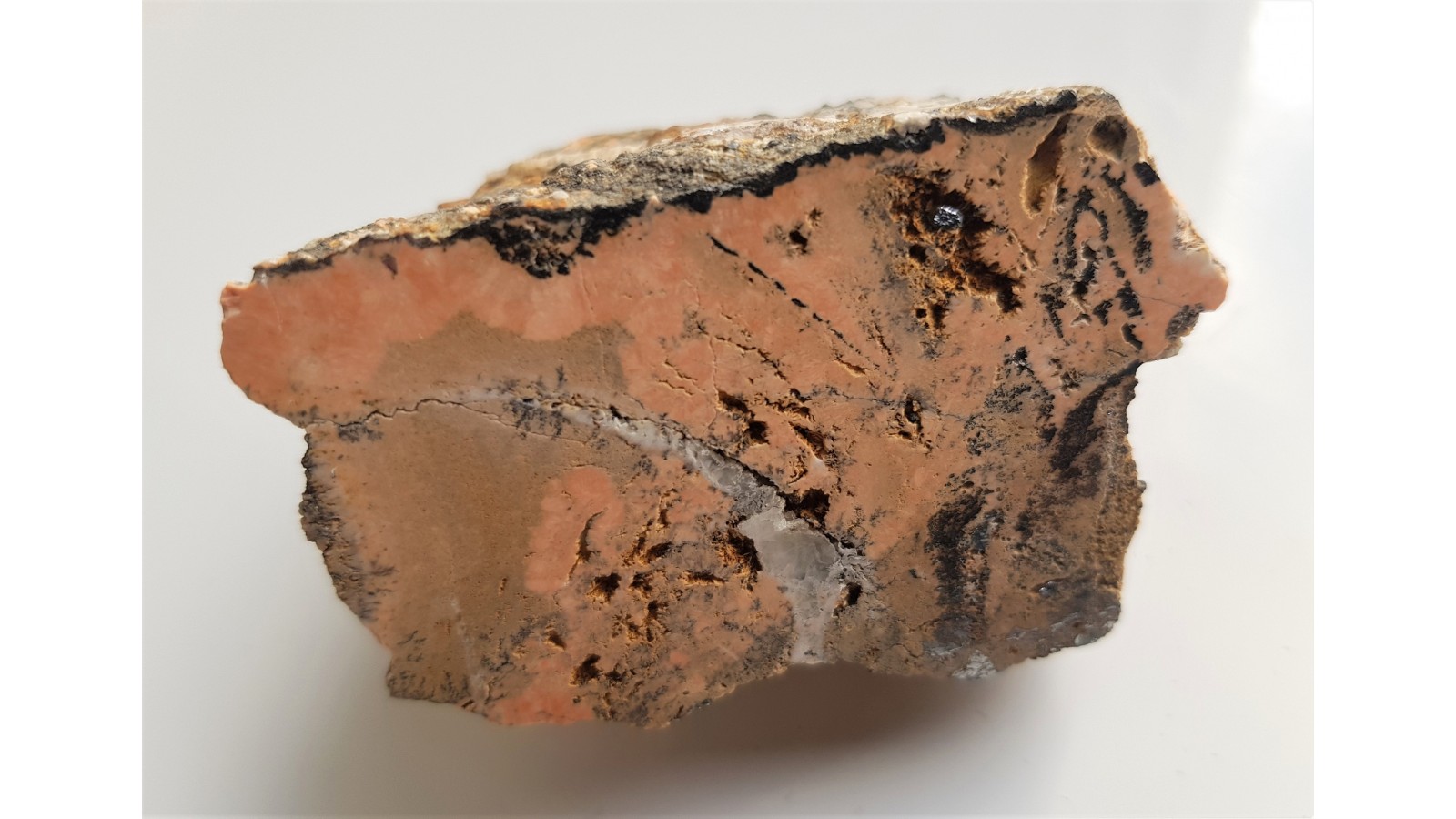 Polerowany okaz wyraźnie różowego, masywnego barytu z kopalni Józefka w Górach Świętokrzyskich. Na przekroju widoczne są także bezbarwne kryształy barytu a także mienrały rudne - głównie galena. Strona przeciwna naturalna, nie cięta. Pojedyncze wystąpienie tego rodzaju sprzed lat. Polecam.