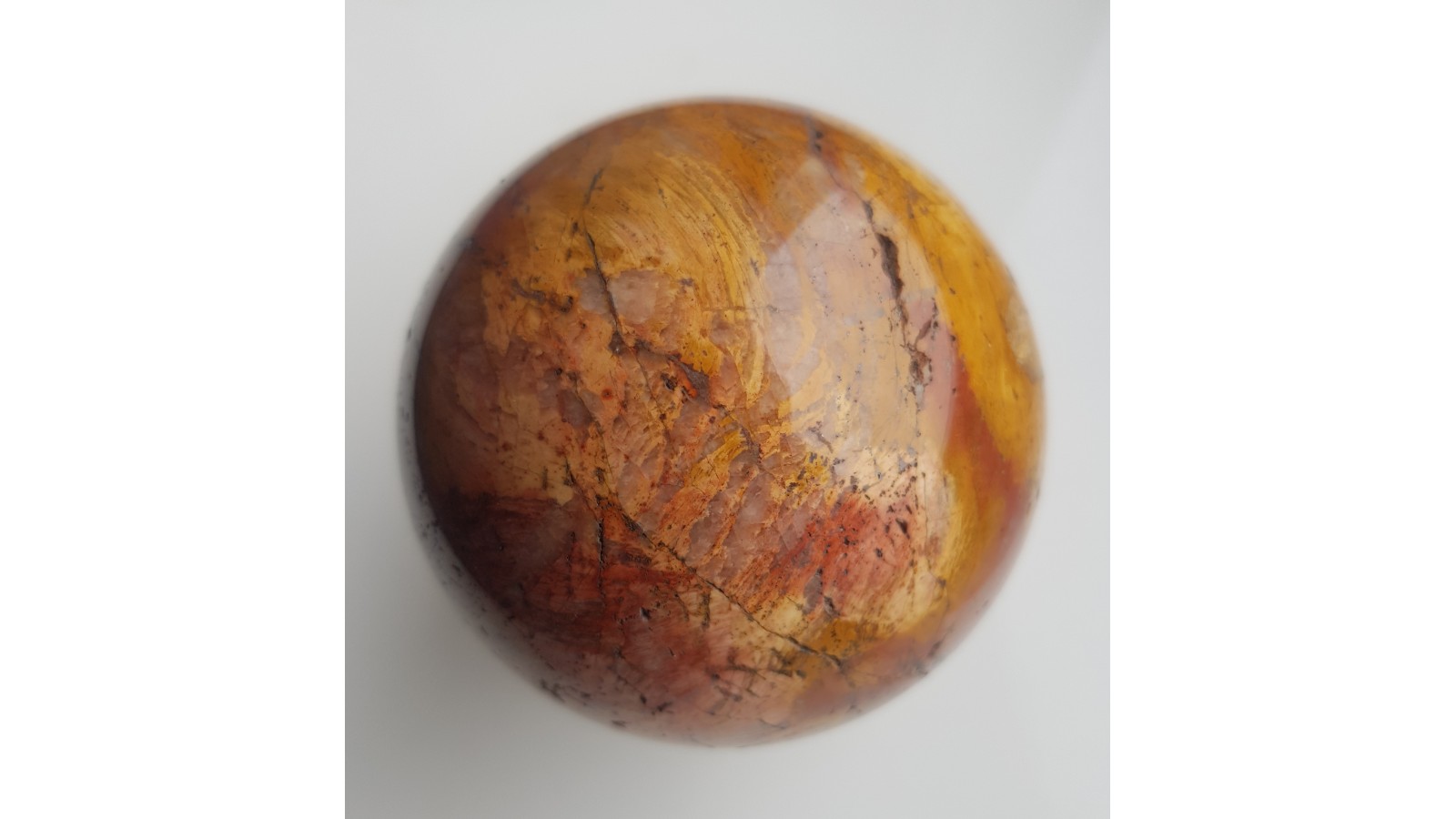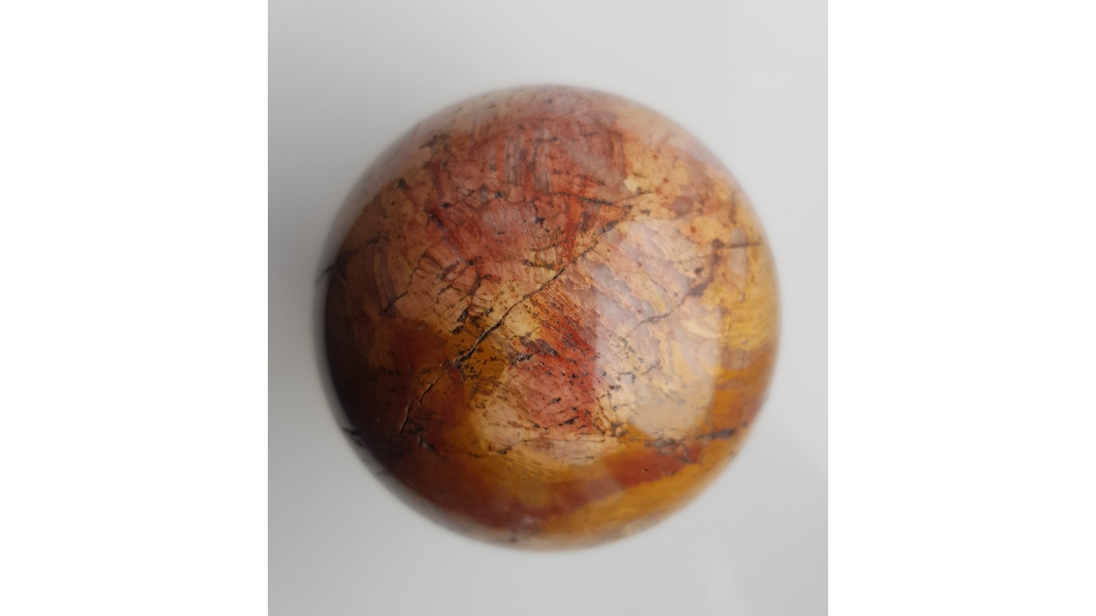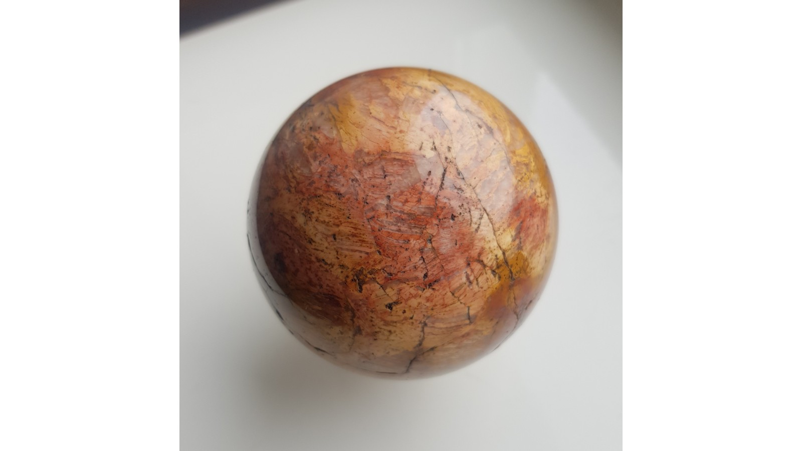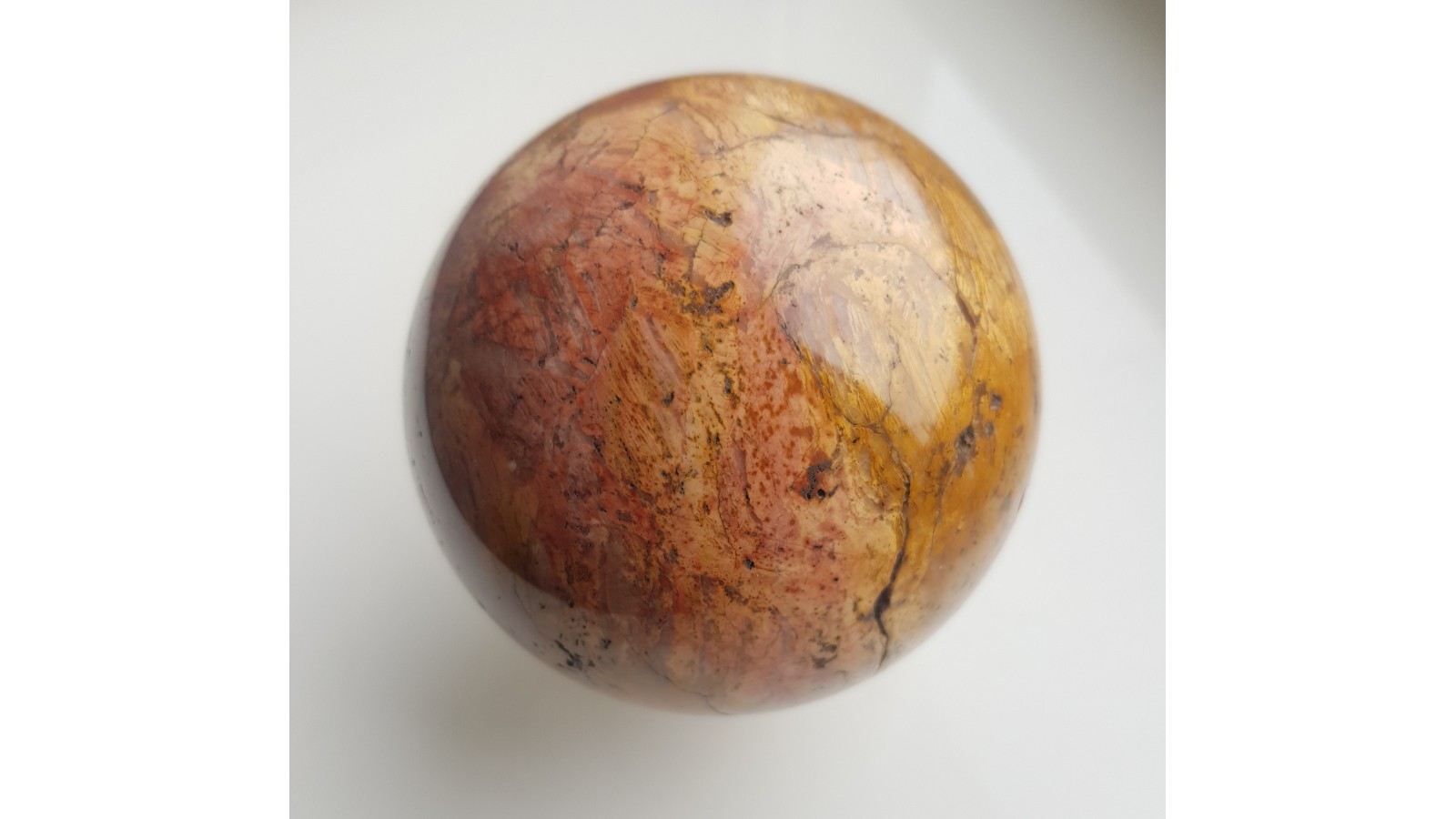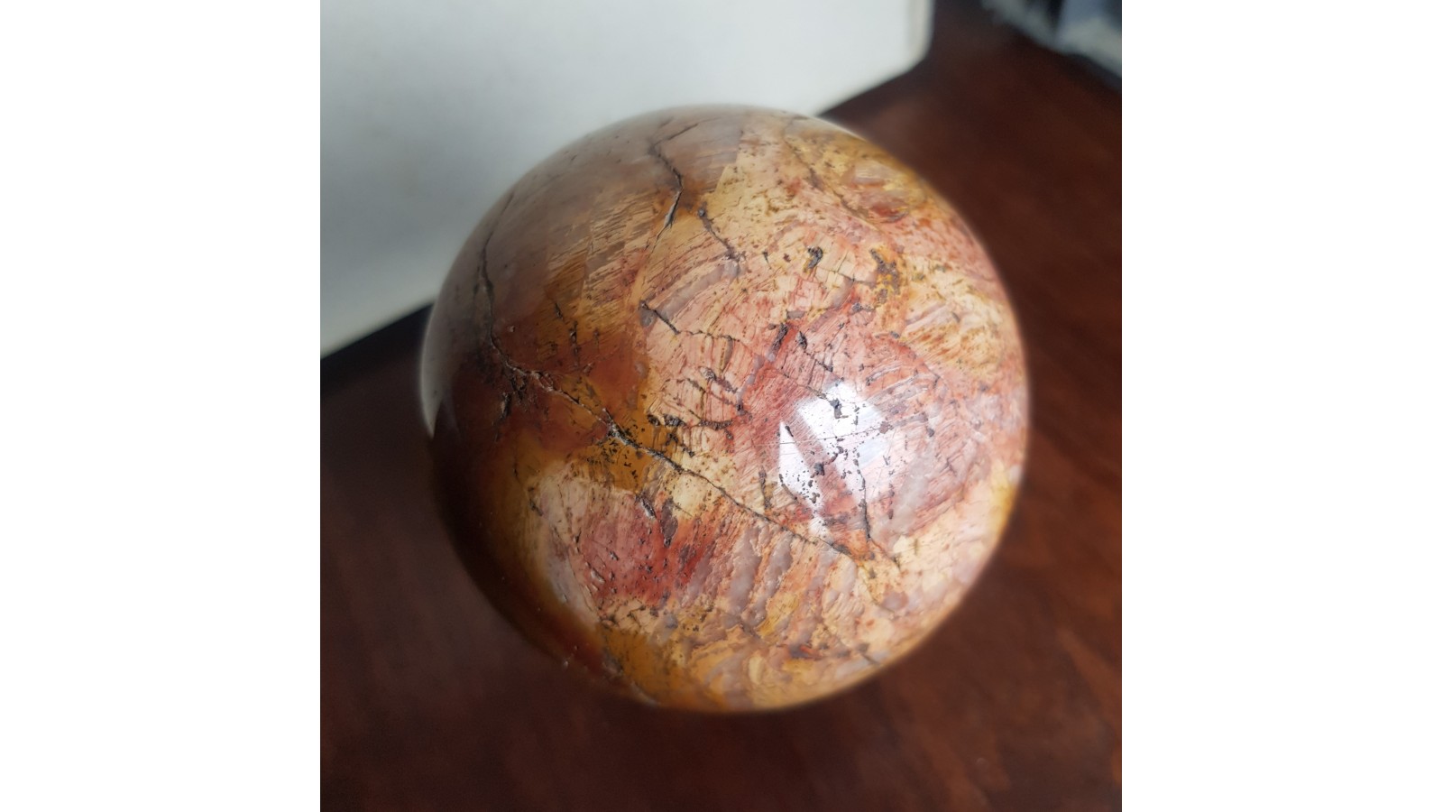 Kula z ozdobnej odmiany skały kwarcowo-serycytowej. Skała pochodzi z osłony masywu strzegomskiego z okolic Żarowa. Wykazuje interesujące efekty dekoracyjne i bardzo dobrze przyjmuje poler. Pierwotny łupek został impregnowany kwarcem oraz związkami żelaza, które są odpowiedzialne za powstanie kontrastowych deseni. Kula masywna, wyjątkowa, bardzo estetyczna. Polecam.