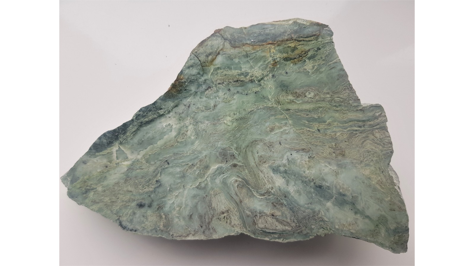 Polerowany okaz zafałdowanego skaru magnezowego z przerostami nefrytu barwy seledynowej ze Złotego Stoku. Świetny poler, historyczna lokalizacja. Nefryt o rzadkiej genezie skarnowej (inny typ w stosunku do jordanowskiego powstającego wskutek przemian serpentynitów). Strona przeciwna naturalna, nie cięta. Polecam okaz do kolekcji sudeckiej.