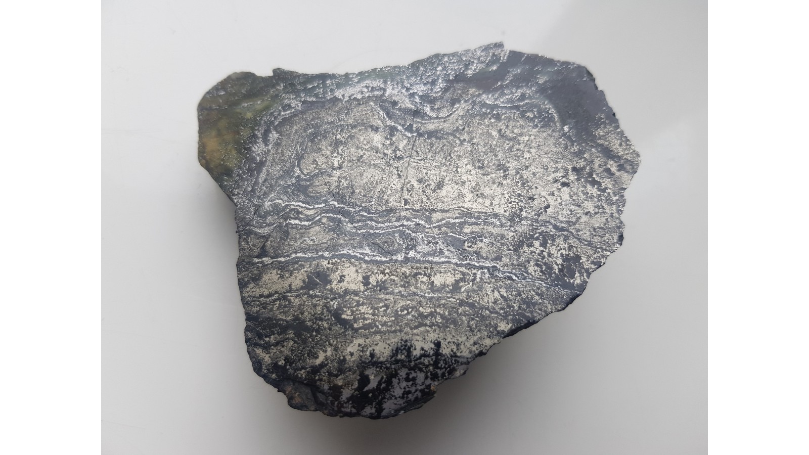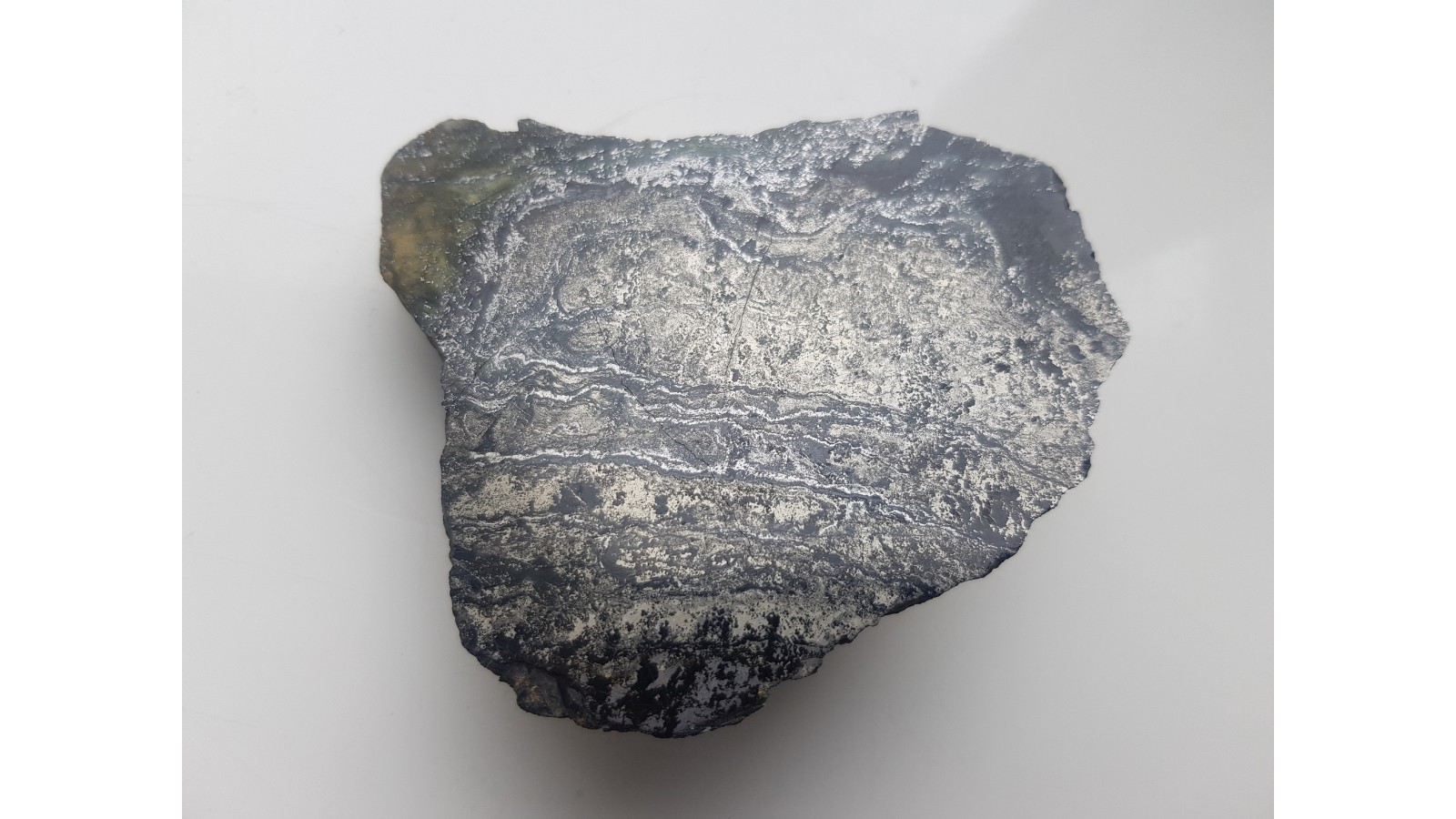 Polerowany okaz złożonej rudy o budowie wstęgowej ze Złotego Stoku. Na zgładzie widoczne są lollingit, arsenopiryt oraz złoto-tombakowy pirotyn układające się w wyraziste, złożone pasma. Ruda jest wyraźnie magnetyczna (przyciąga magnes). Strona odwrotna naturalna, nie cięta. Bardzo estetyczny okaz, doskonały poler. Polecam.