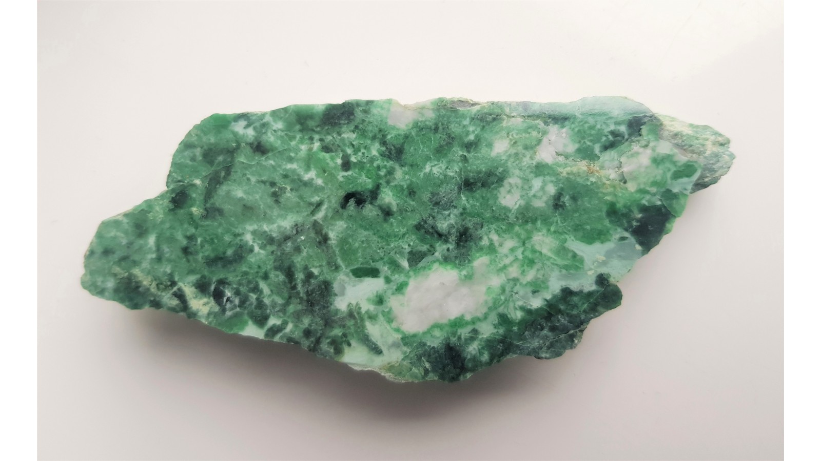 Polerowany okaz jadeitu z lokalizacji Itmurundy, na stepie w pobliżu jeziora Bałchasz w Kazachstanie. Złoże jadeitu w serpentynitach razem z tzw. kwarcem lodowym. Piękna, szmaragdowozielona barwa w partiach okazu. Strona przeciwna naturalna, nie cięta. Polecam.