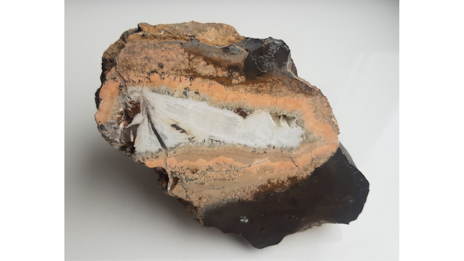 Polerowany okaz wyraźnie różowego, masywnego barytu z kopalni Józefka w Górach Świętokrzyskich. Na przekroju widoczne są także w centralnej części duże, białe kryształy barytu. Ciemna strefa to dolomit pochodzenia osadowego. Strona przeciwna naturalna, nie cięta. Pojedyncze wystąpienie tego rodzaju sprzed lat. Polecam.