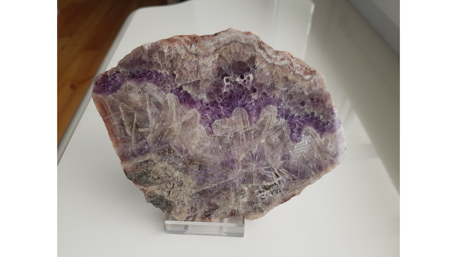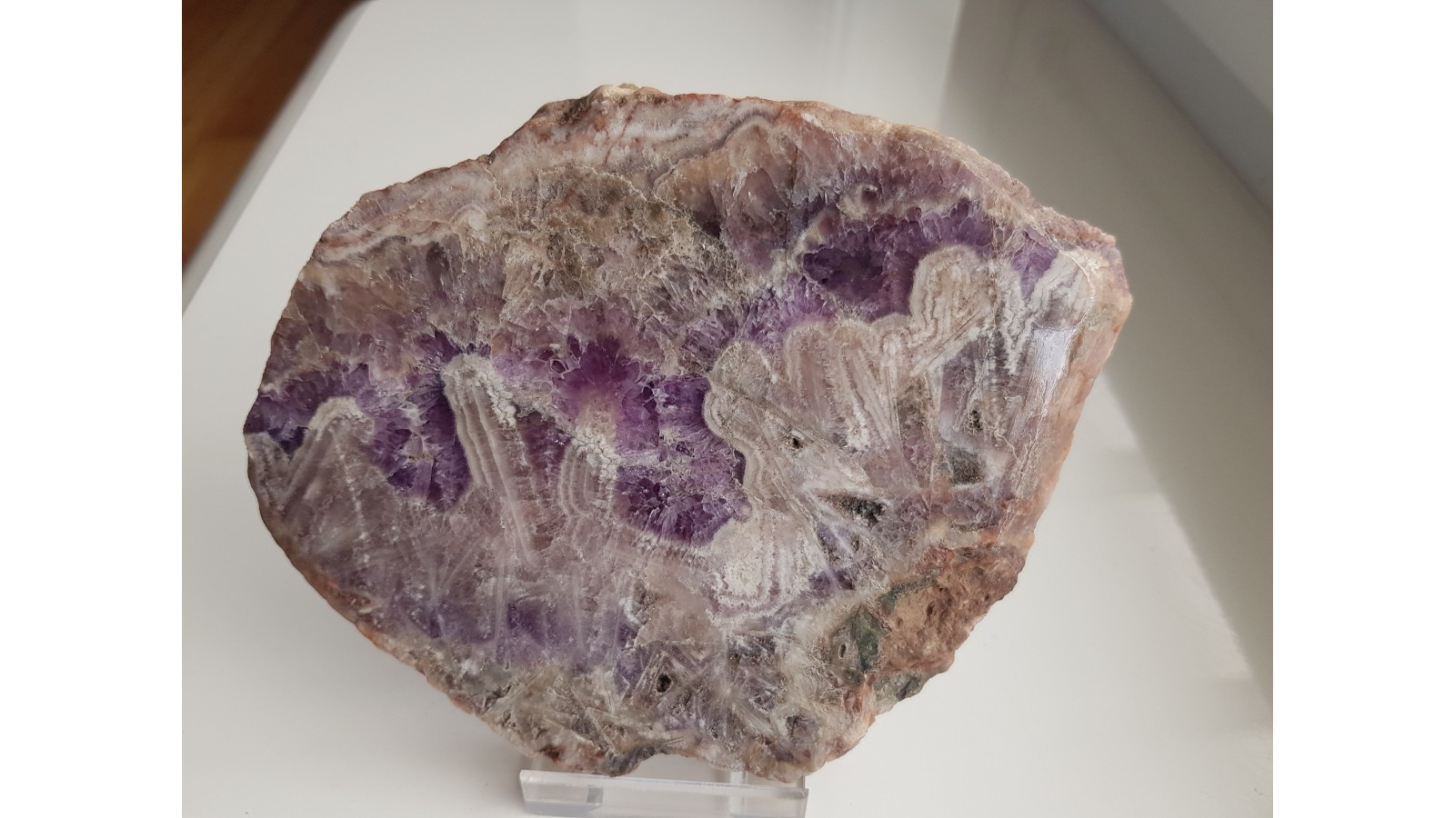Okaz najwyższej klasy ametystu z klasycznej sudeckiej lokalizacji z Kwietnik k. Bolkowa. Wspaniałe formy pseudostalaktytowe widoczne po obydwu stronach płytki. Polerowany dwustronnie. Bardzo nasycona barwa ametystu i wyjątkowy deseń. Brak istotnych spękań, jedynie drobne, nie wpływające na estetykę okazu. Polecam.