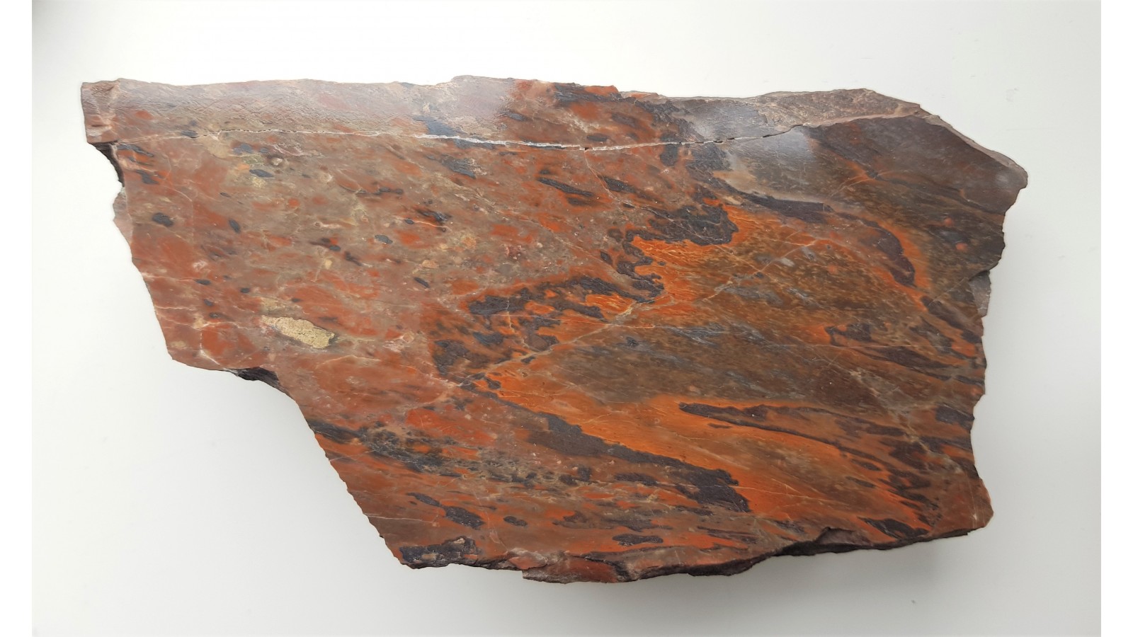 Keratofir z wyraźnymi teksturami fluidalnymi z Gór Kaczawskich. Zbliżona składem mineralnym do trachitu, zawierająca bogate w sód plagioklazy. Wiek najprawdopodobniej staropaleozoiczny. Skała intensywnie skrzemionkowana, doskonale się polerująca. Piękna barwa i deseń. Skała ozdobna. Idealny poler, strona przeciwna naturalna, nie cięta. Polecam.