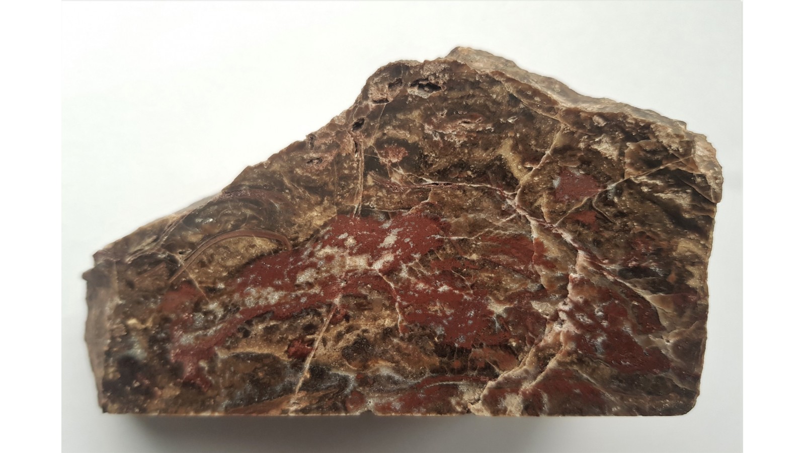 Brązowo-czerwony jaspis z historycznej lokalizacji w rowie Czerwieńczyc pomiędzy Nową Rudą a Kłodzkiem. Jaspis miejscami mocno okwarcowany, z widocznymi kryształkami kwarcu. Jaspisy pochodzą z diabazów. Idealny poler. Nieznane wśrod kolekcjonerów miejsce występowania jaspisu i bardzo rzadko - agatów jako strefy w jaspisach. Strona przeciwna naturalna, nie cięta. Ciekawostka z uwagi na lokalizację.