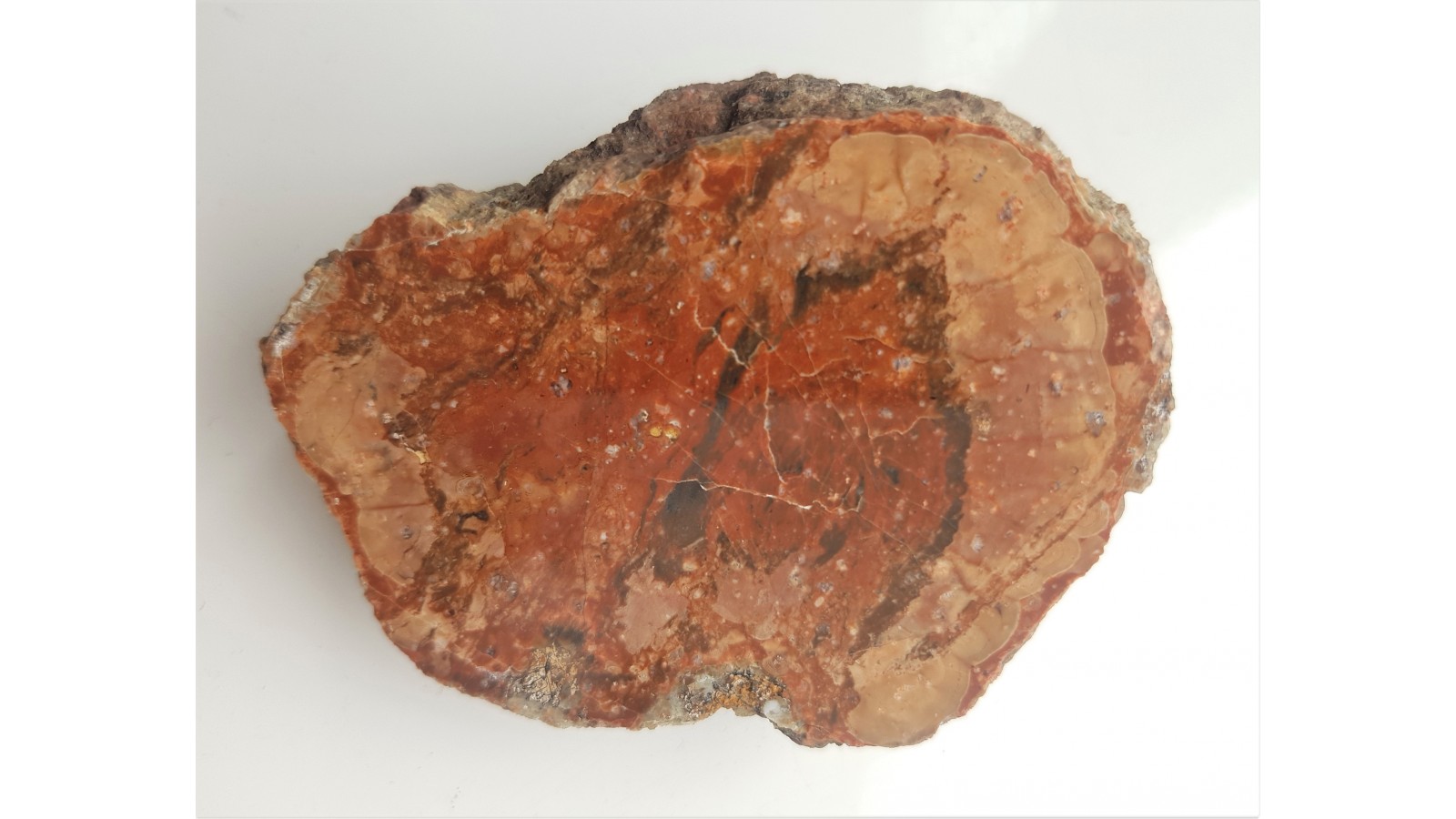Pełny przekrój przez kulę z porfirów kulistych z jedynego stanowiska tej skały w Sudetach, w Jedlinie-Zdroju. Wewnątrz struktury będące zapisem kształtowania się sfer, tj. koncentryczne odwarstwienia, możliwe, że na podobieństwo litofyz agatowych, związane z procesami zeszklenia bądź uwalniania gazów w trakcie spadku ciśnienia w trakcie wynoszenia stopu krzemianowego ku górze. Strona przeciwna naturalna, nie cięta, fragment kuli. Osobliwość petrologiczna Sudetów Środkowych. Polecam.