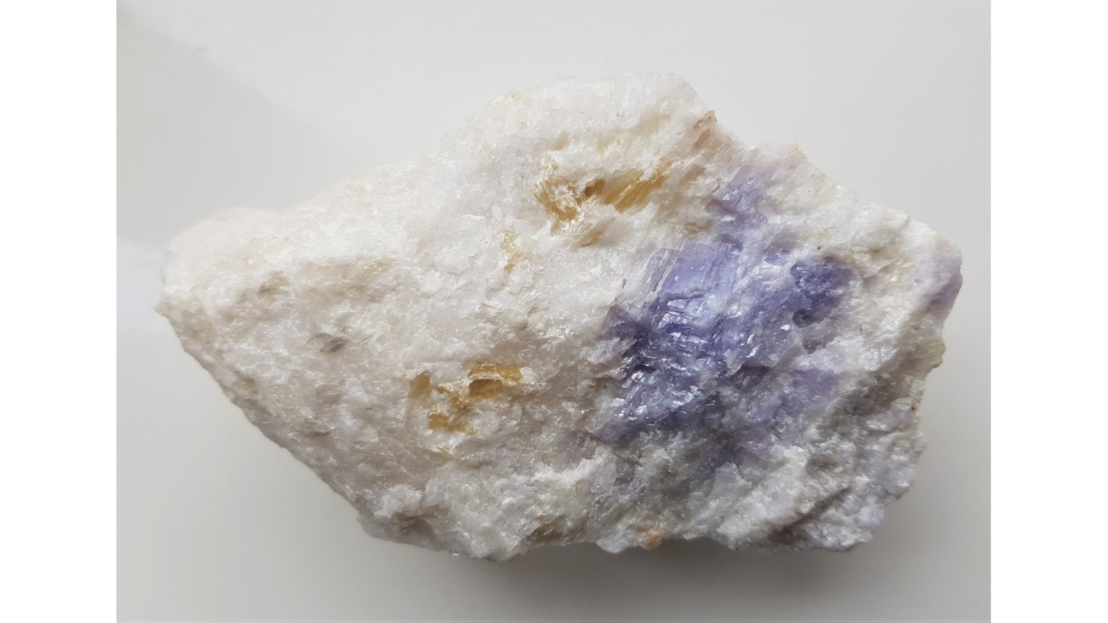 Wrośnięte w marmur kryształy rzadkiej, intensywnie fioletowej odmiany skapolitu (glaukolit) ze Sludianki nad Bajkałem. Bardzo ładny kontrast kolorystyczny. Widoczne ścianki oraz powierzchnie łupliwości wrośniętych kryształów skapolitu. Rzadko występująca lokalizacja. Polecam.