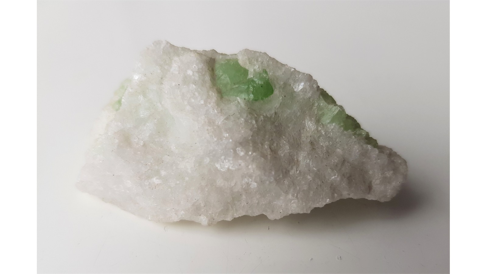 Wrośnięte w marmur kryształy rzadkiej, intensywnie zielonej, wanadowej odmiany diopsydu (ławrowit) ze Sludianki nad Bajkałem. Bardzo ładny kontrast kolorystyczny. Widoczne ścianki kryształów oraz powierzchnie łupliwości wrośniętych kryształów ławrowitu. Pięknie przęświeca pod światło co zostało uwidocznione na zdjęciu. Bardzo rzadki minerał oraz lokalizacja. Polecam.