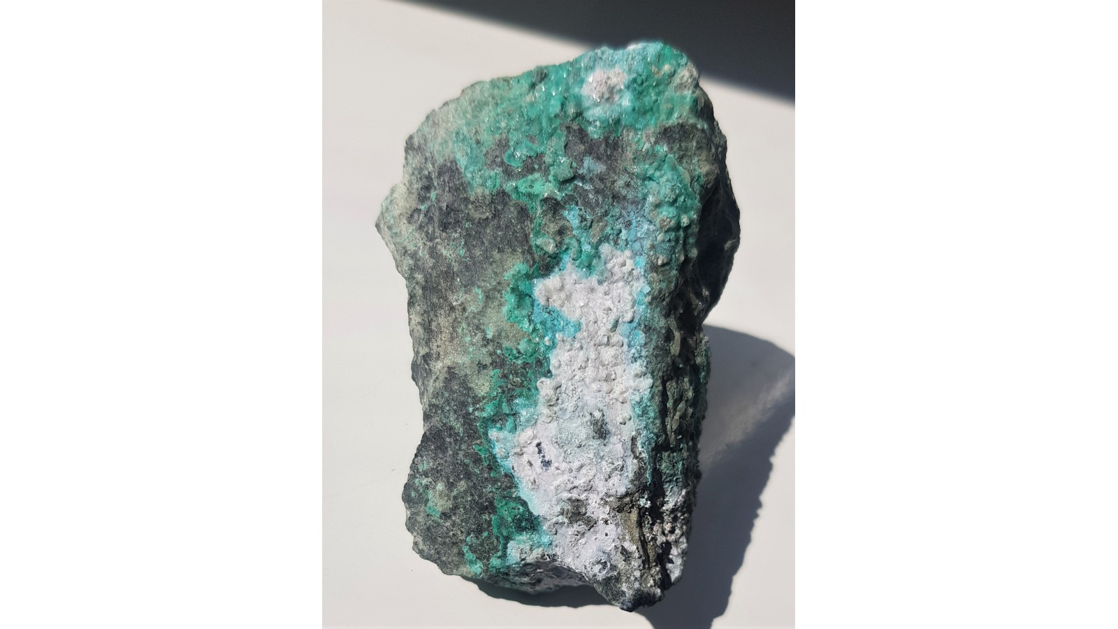 Śnieżnobiały hydrocynkit razem z innymi rzadkimi minerałami: devillinem i langitem z Ciechanowic k. Miedzianki sudeckiej. Ciekawostka mineralogiczna do kolekcji regionalnej. Okaz prezentuje się bardzo estetycznie. Polecam.