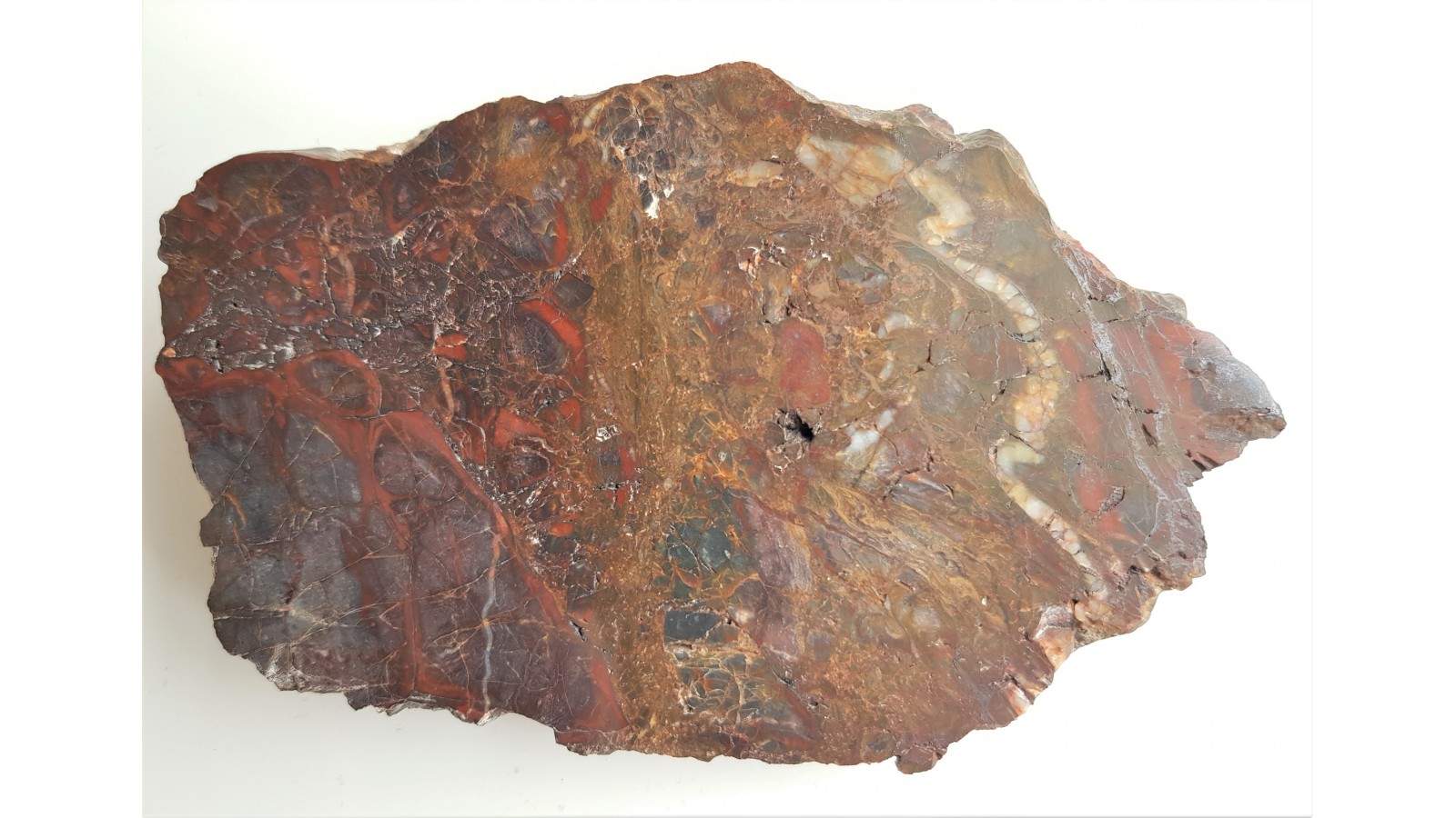 Brekcja jaspisowa z rowu Świerzawy w Górach Kaczawskich. Skała o dużych walorach ozdobnych. Brekcja składa się z fragmentów ciemnych łupków krzemionkowych, które podległy w szeregu miejsc przepojeniu roztworami zawierającymi żelazo oraz przeobrażeniu w czerwony jaspis. Idealny poler z jednej strony, strona przeciwna po cięciu. Polecam.