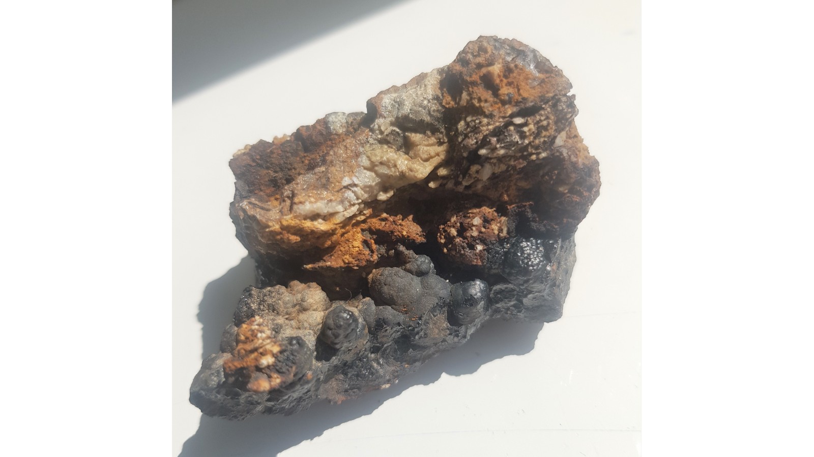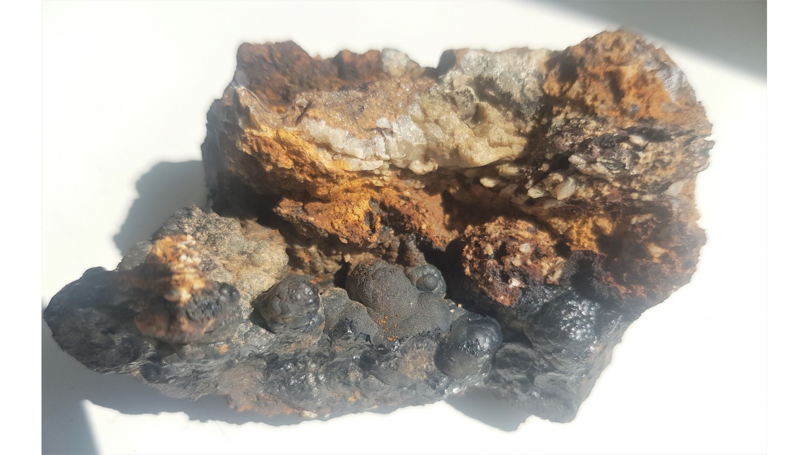 Wyraziste naciekowe skupienia henatytu o charakterystycznym połysku, tzw. szzklane głowy z nietypowej loklalizacji - kopalni Dorothea w Janowicach Wlk. w której wydobywano rudy ołowiu oraz piryt. Polecam.