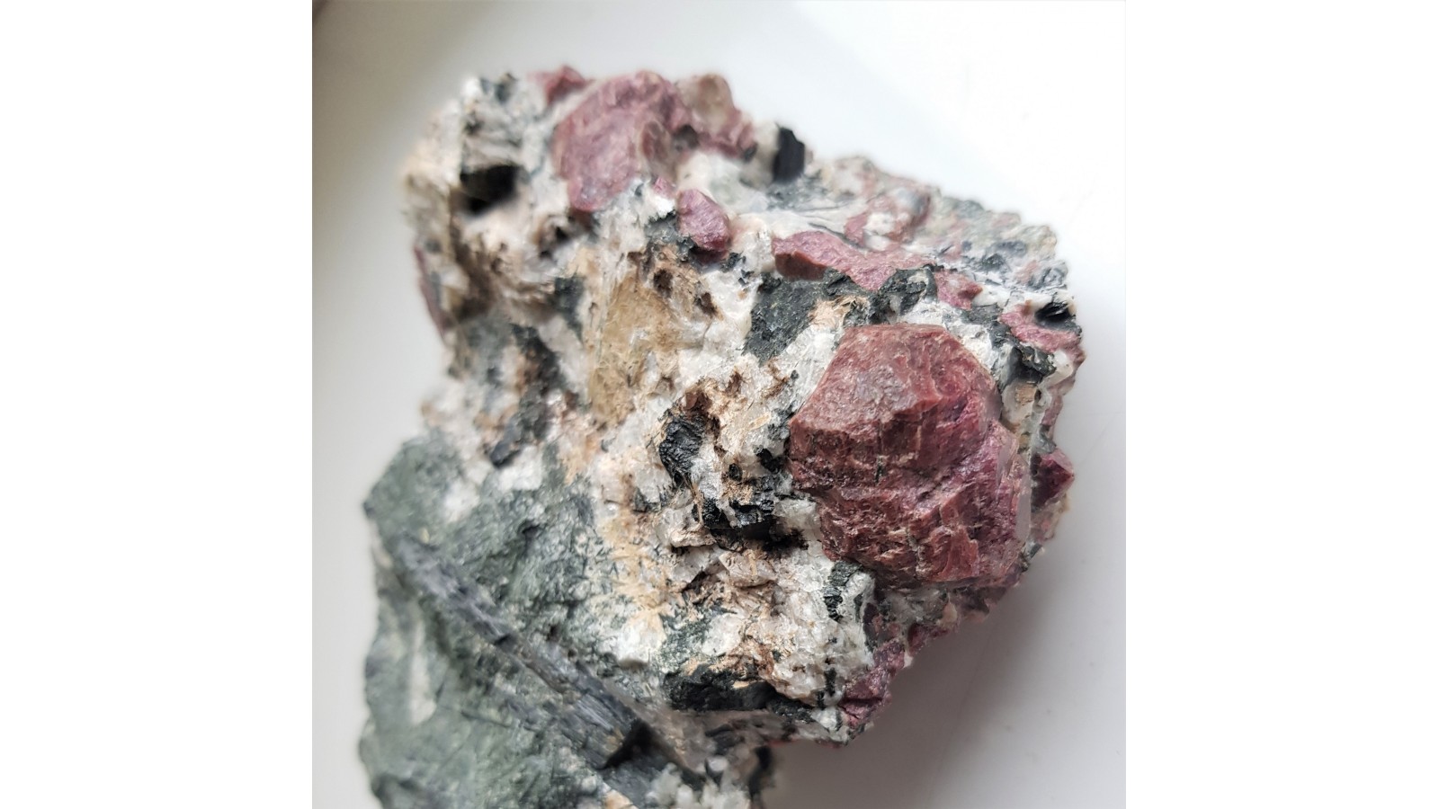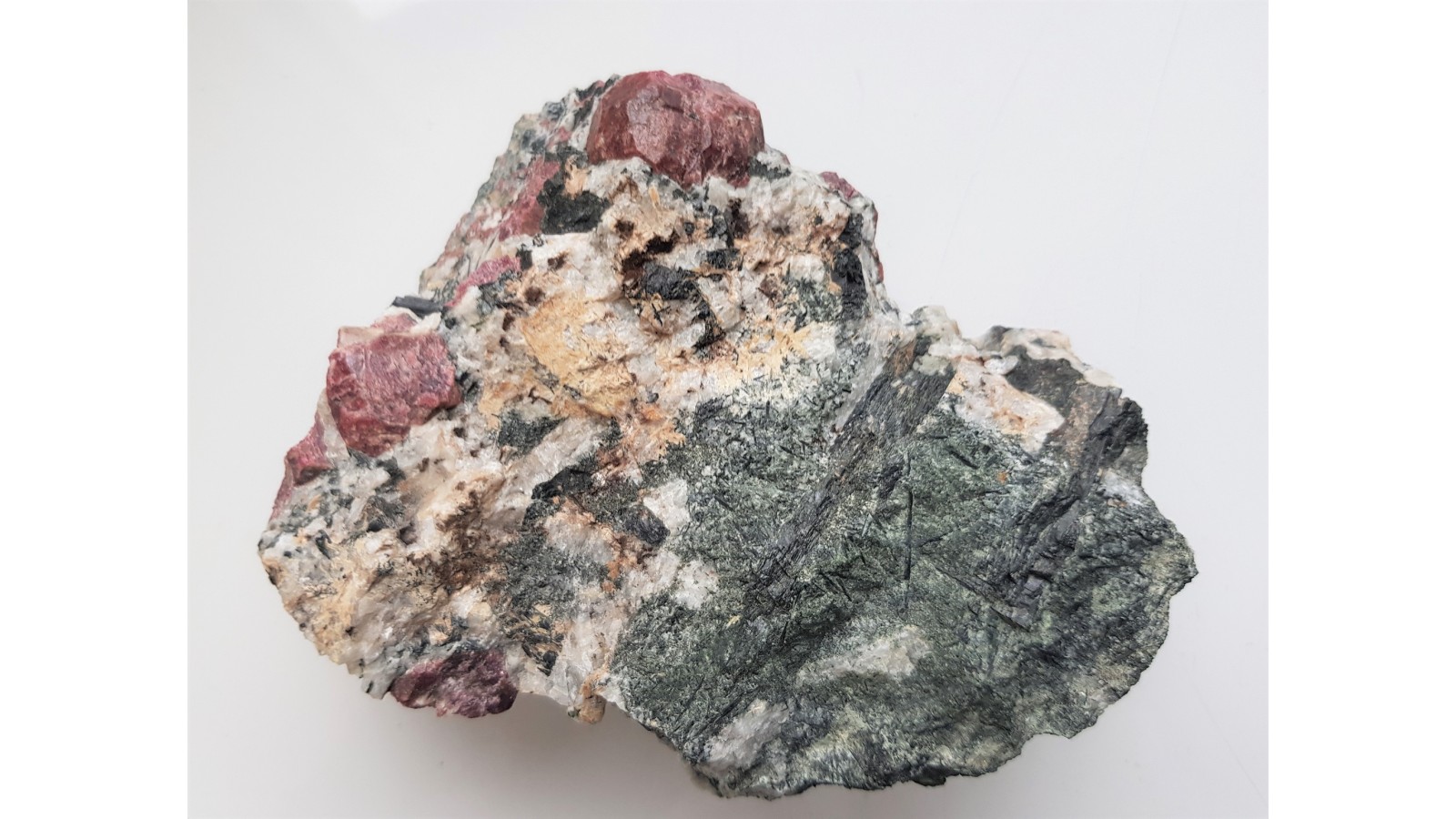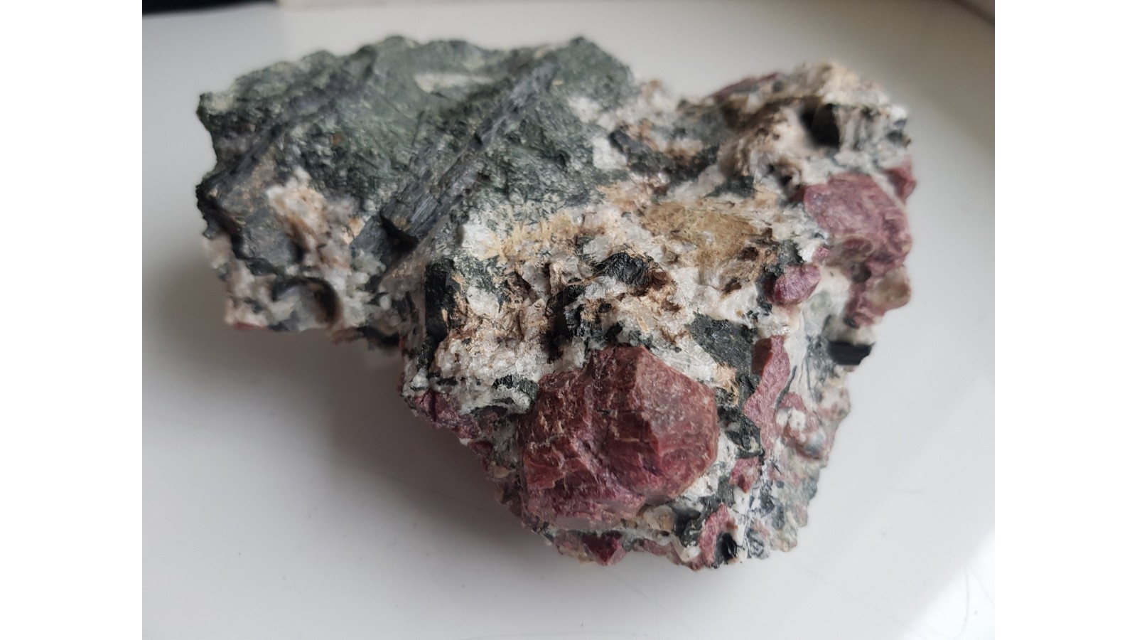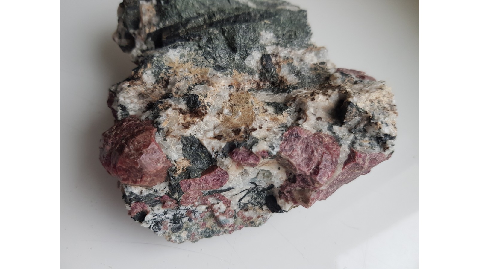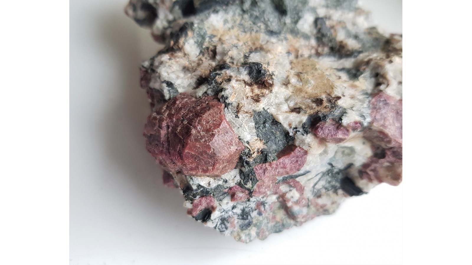 Kryształy eudialitu w skale rodzimej - sjenicie z doskonale wykształconymi igłowymi kryształami amfiboli. Największy zrost kryształów nieuszkodzony, cały. Wyjątkowy okaz z uwagi na wielkość kryształów eudialitu (sam zrost dwóch głównych kryształów ma prawie 3 cm). Nasycona barwa kryształów. Okaz z własnego wyjazdu, pozyskany samodzielnie jako jeden z zaledwie kilu takiej jakości. Polecam.