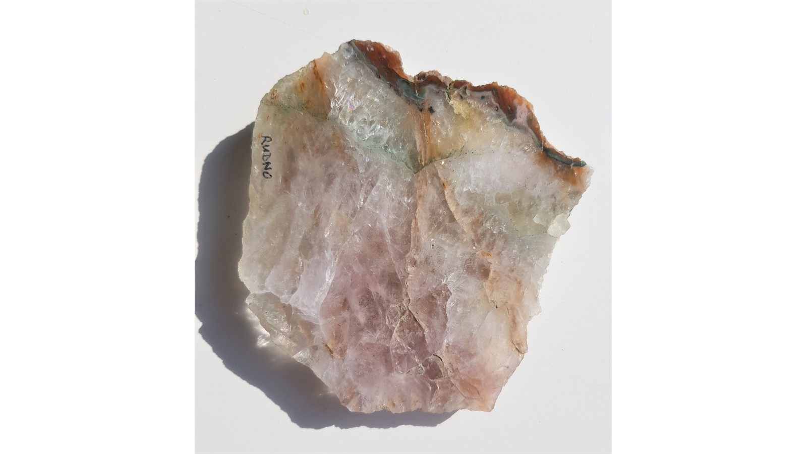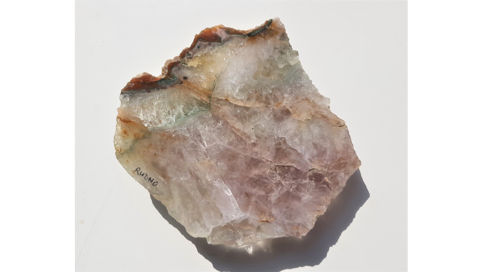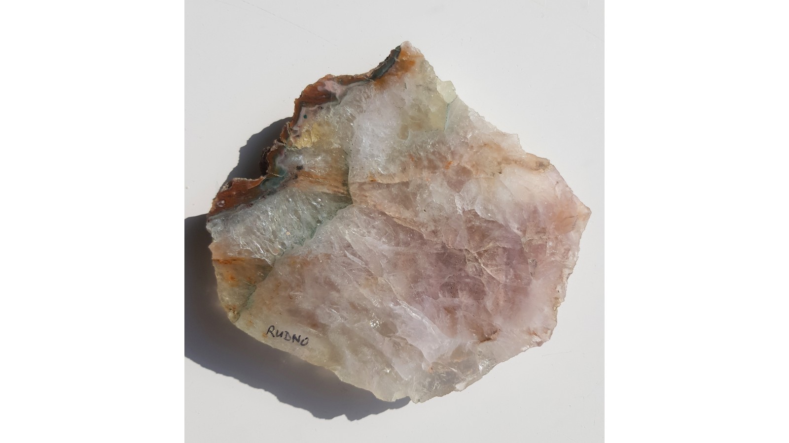 Barwny kwarc z Rudna k. Krakowa. Jedna z generacji pokryta zielono utlenionymi minerałami rudnymi. Pozostała część różowo-fioletowawa. Widoczna także strefa marginalna z chalcedonem. Okaz polerowany jednostronnie. Bardzo estetyczny, strona przeciwna naturalna. Dosyć duży okaz. Polecam.