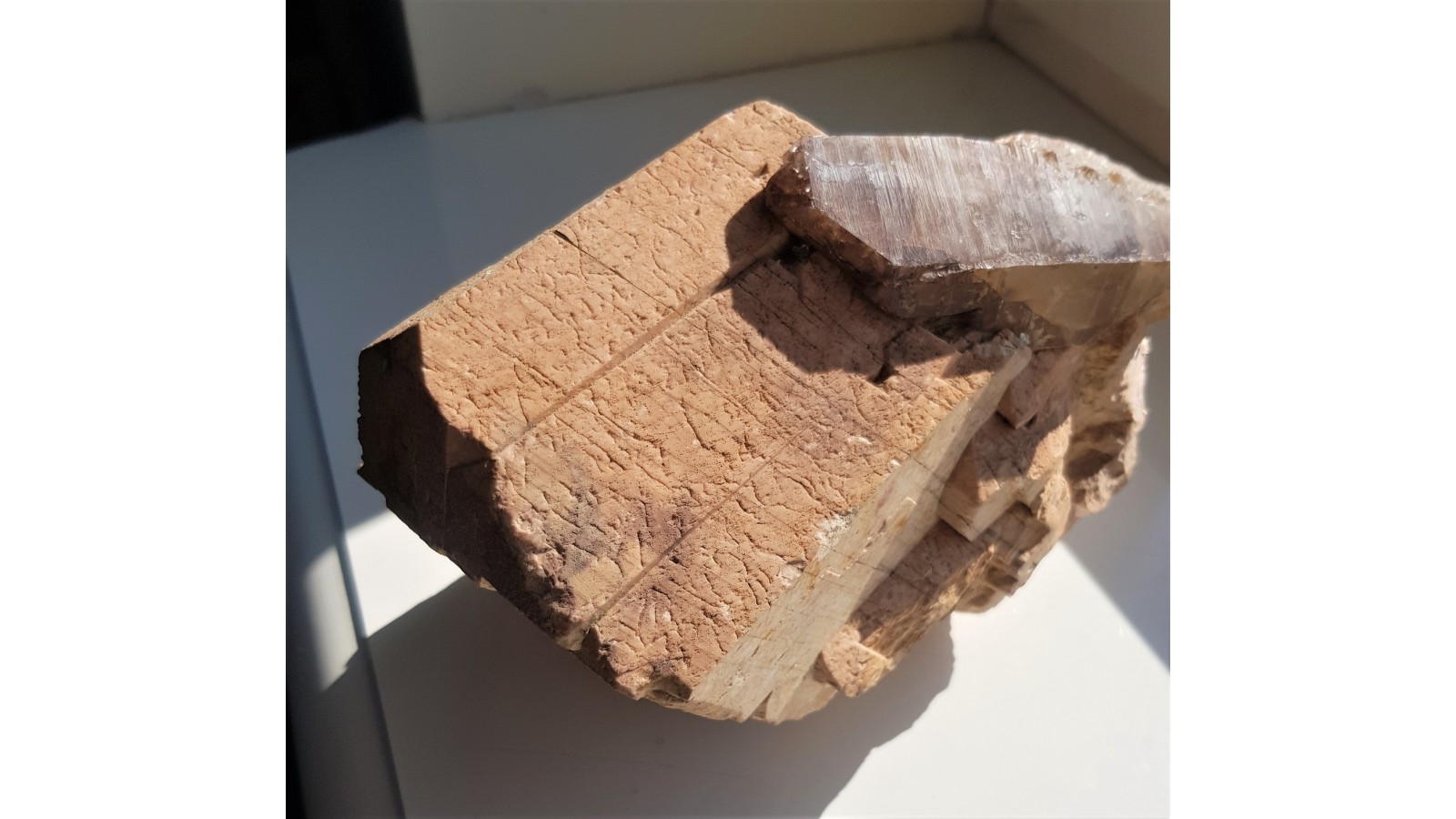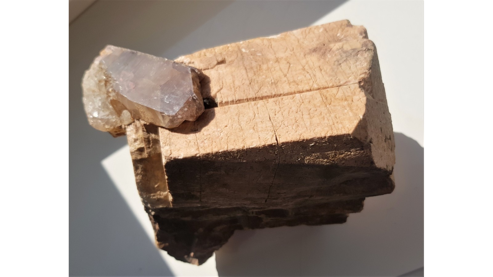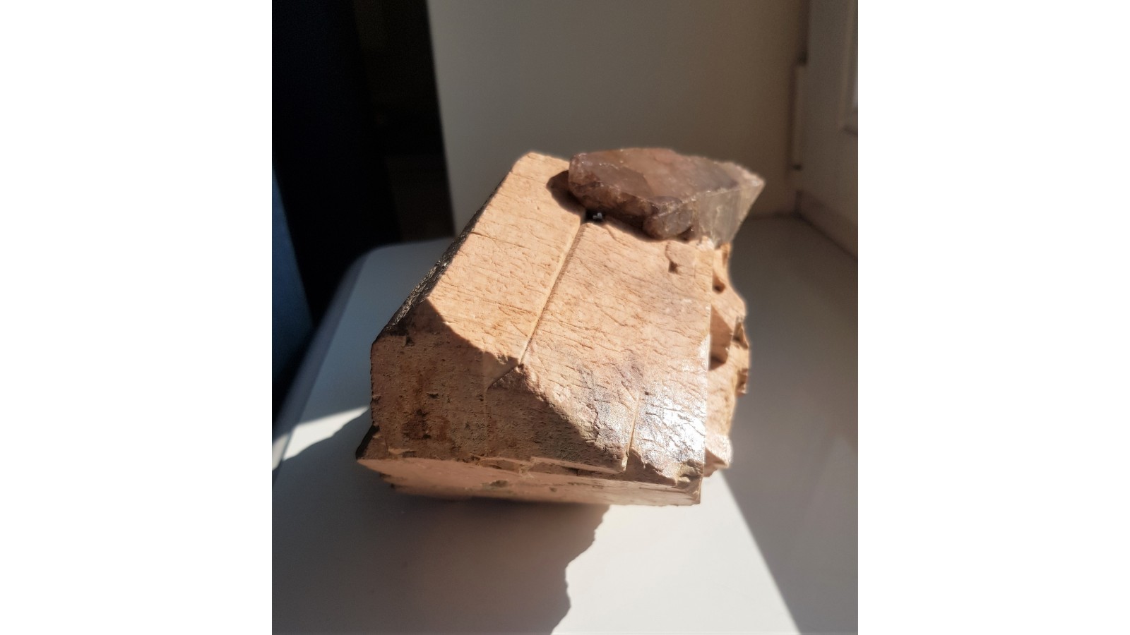 Bardzo okazały, idealnie wykształcony kryształ skalenia z narośniętym na jednej ze ścian kwarcem dymnym z hematytem pochodzący z pegmatytów okolic Jeleniej Góry. Zarówno skaleń jak i kwarc bez żadnych uszkodzeń, idealnie wykształcone, bez jakichkolwiek uszkodzeń. Wyjątkowej jakości, duży kryształ skalenia z narośniętym kwarcem. Okaz muzealny. Polecam.