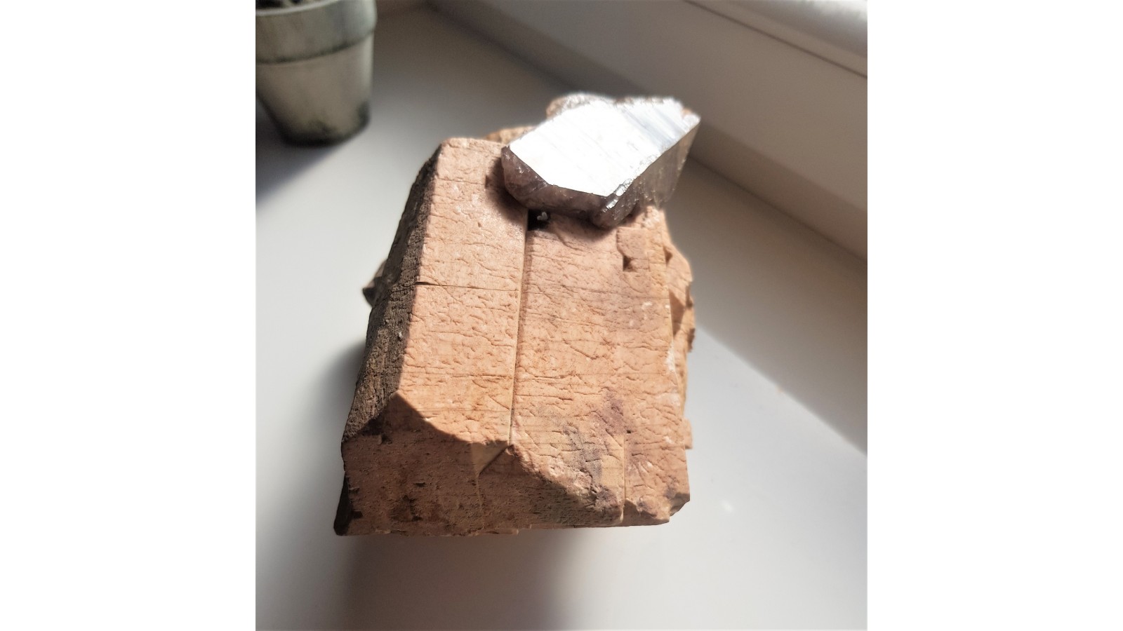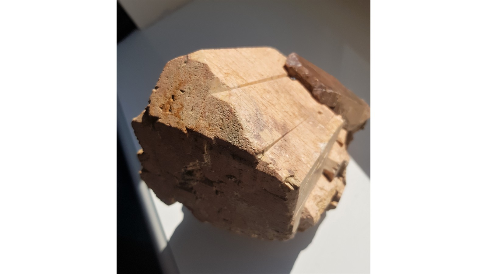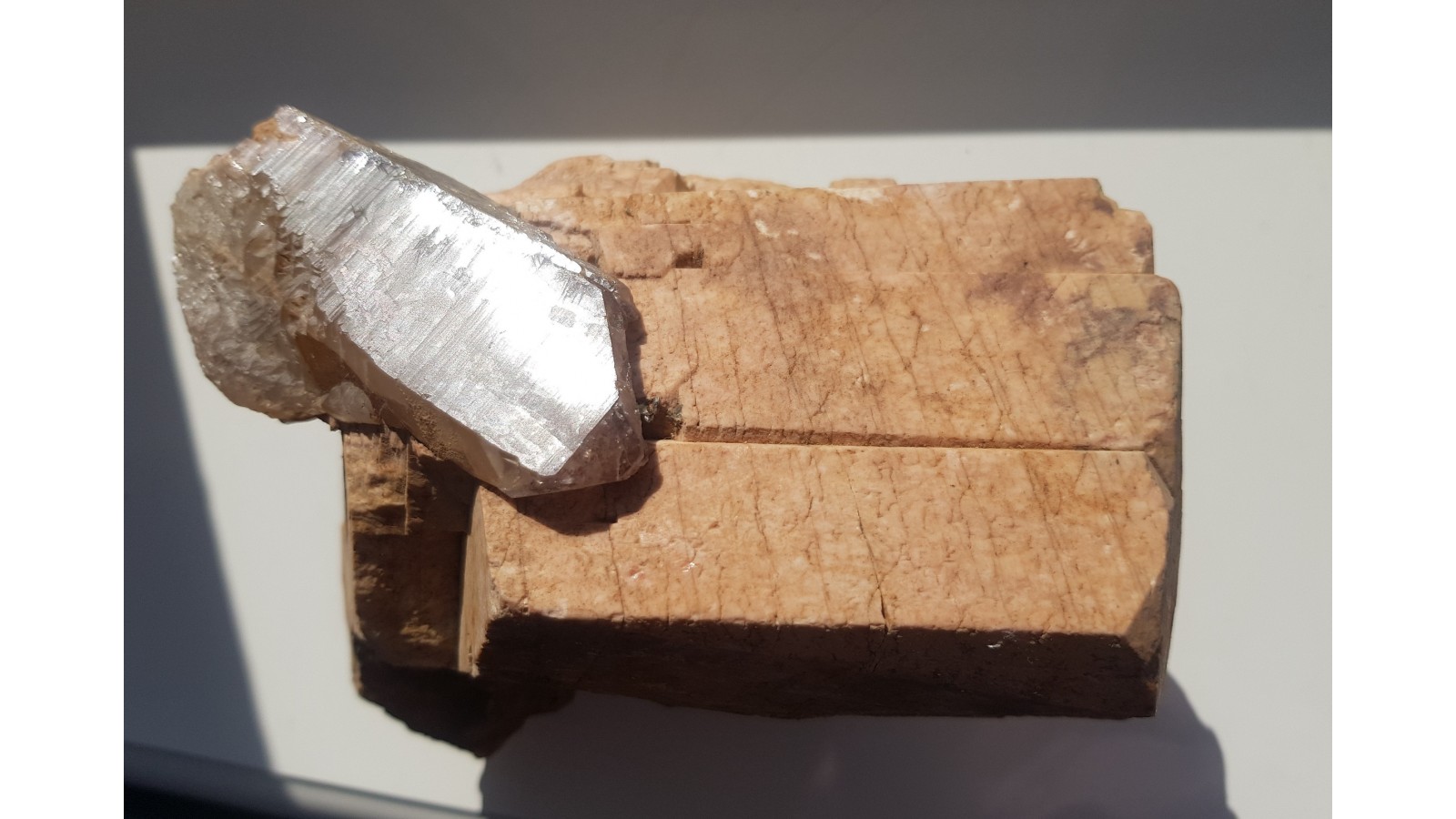Bardzo okazały, idealnie wykształcony kryształ skalenia z narośniętym na jednej ze ścian kwarcem dymnym z hematytem pochodzący z pegmatytów okolic Jeleniej Góry. Zarówno skaleń jak i kwarc bez żadnych uszkodzeń, idealnie wykształcone, bez jakichkolwiek uszkodzeń. Wyjątkowej jakości, duży kryształ skalenia z narośniętym kwarcem. Okaz muzealny. Polecam.
