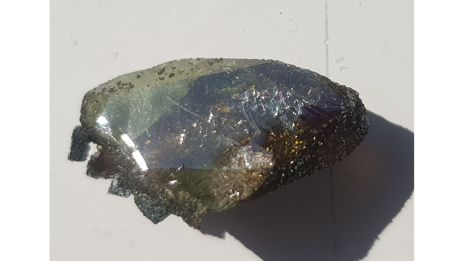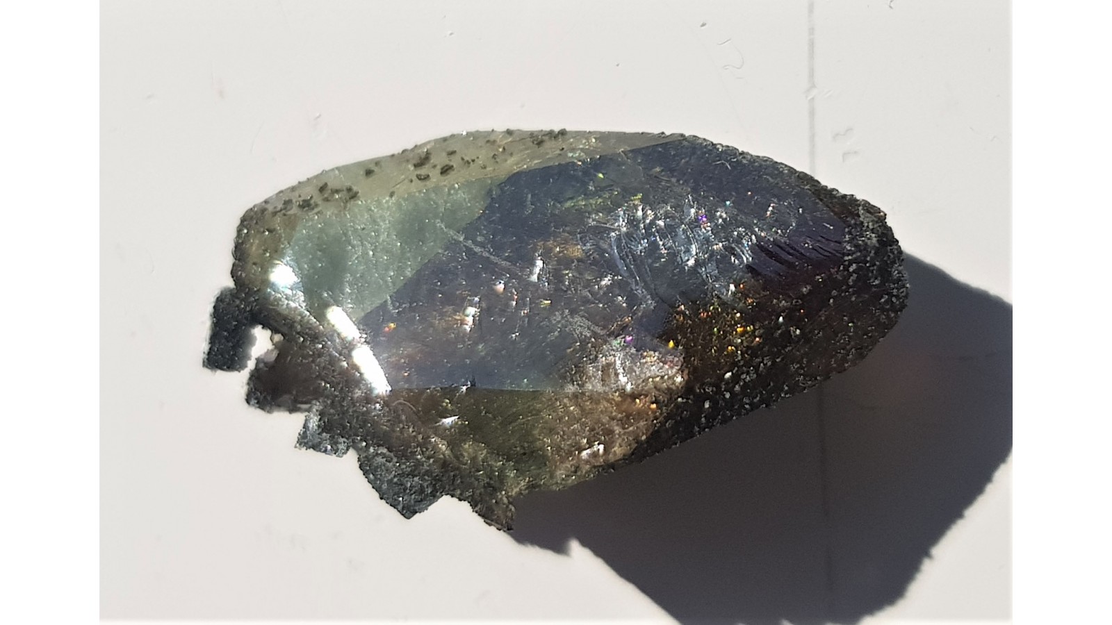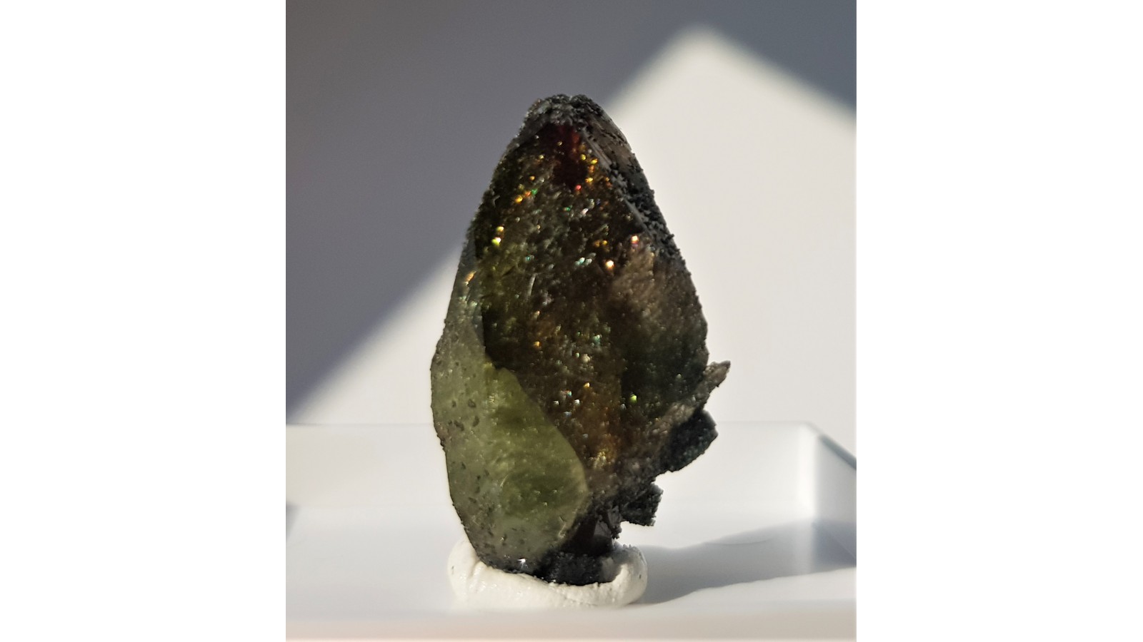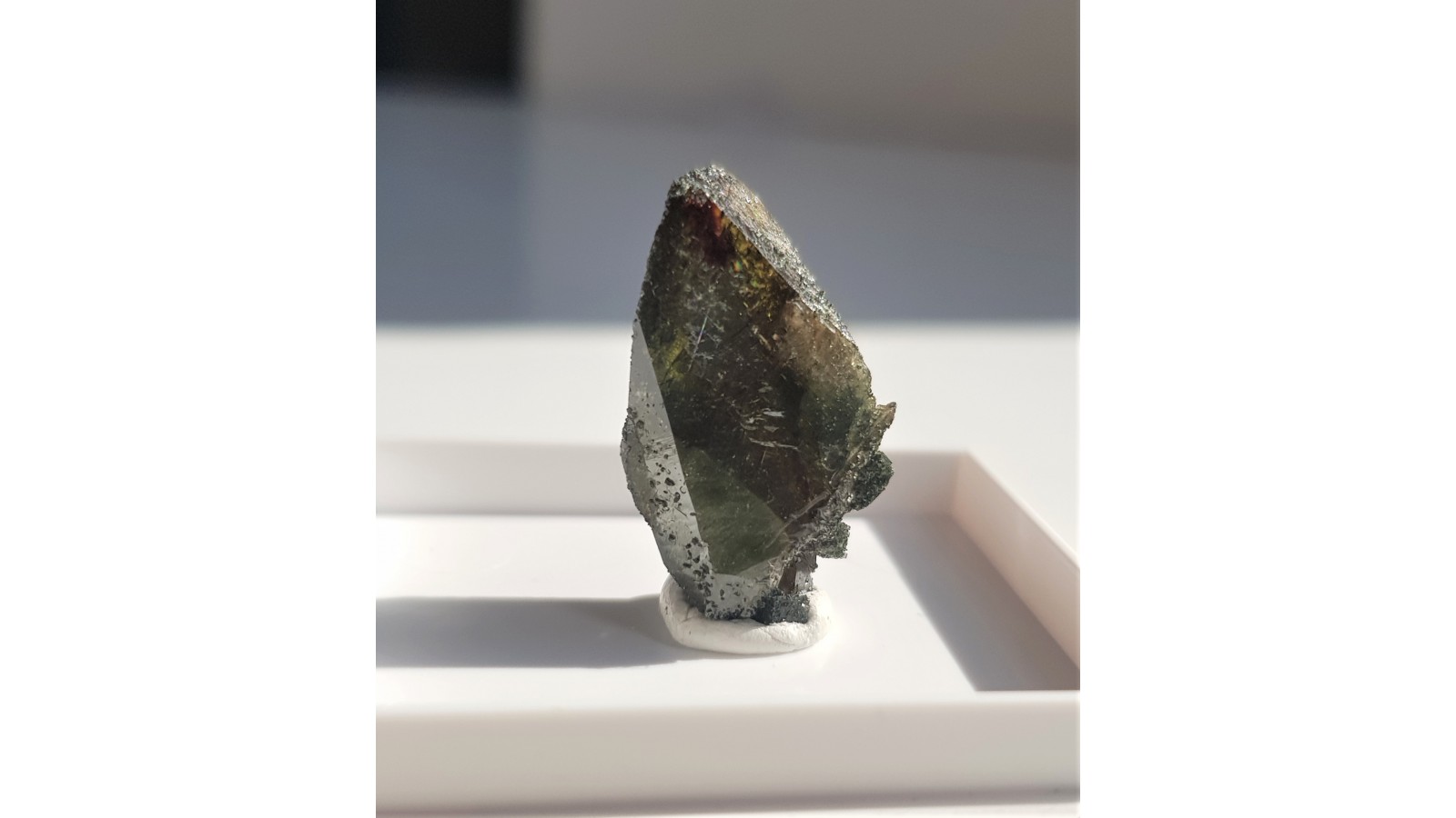 Wyjątkowy okaz tytanitu z pustki w żyle alpejskie z Wysokich Taurów, Felbertal (Alpy, Austria). Tytanit barwy zielonej, połysk ścian diamentowy, idealny, bez żadnych uszkodzeń, pływak. Strona przeciwna - zbliźniaczenie z drugim kryształem, także doskonale wykształconym, pokryta chlorytami. Kryształ częściowo przezroczysty, piękna, nasycona barwa zielona, delikatne wrostki chlorytów powodują efekt awenturescencji widoczny w oświetleniu. Wyjątkowej urody okaz. Polecam.