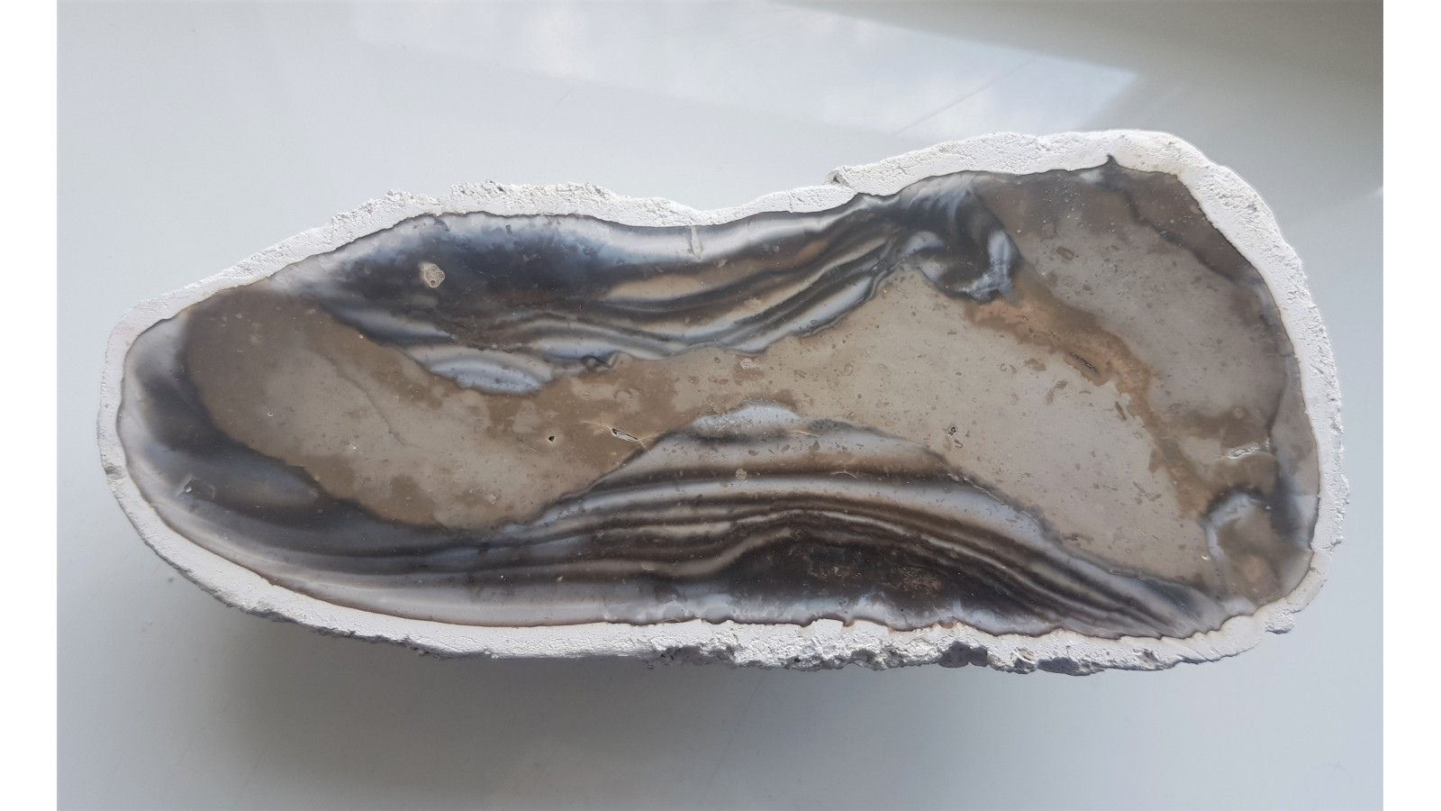 Polerowany okaz krzemienia z Raciszyna k. Działoszyna (Jura Wieluńska). Okaz jest idealny, bez żadnych spękań i niedoskonałości. Połówka dużej buły. Tył naturalny, bez uszkodzeń. Lokalizacja mało znana. Pochodzi z niej niewiele dobrych okazów. Piękny deseń. Polecam.