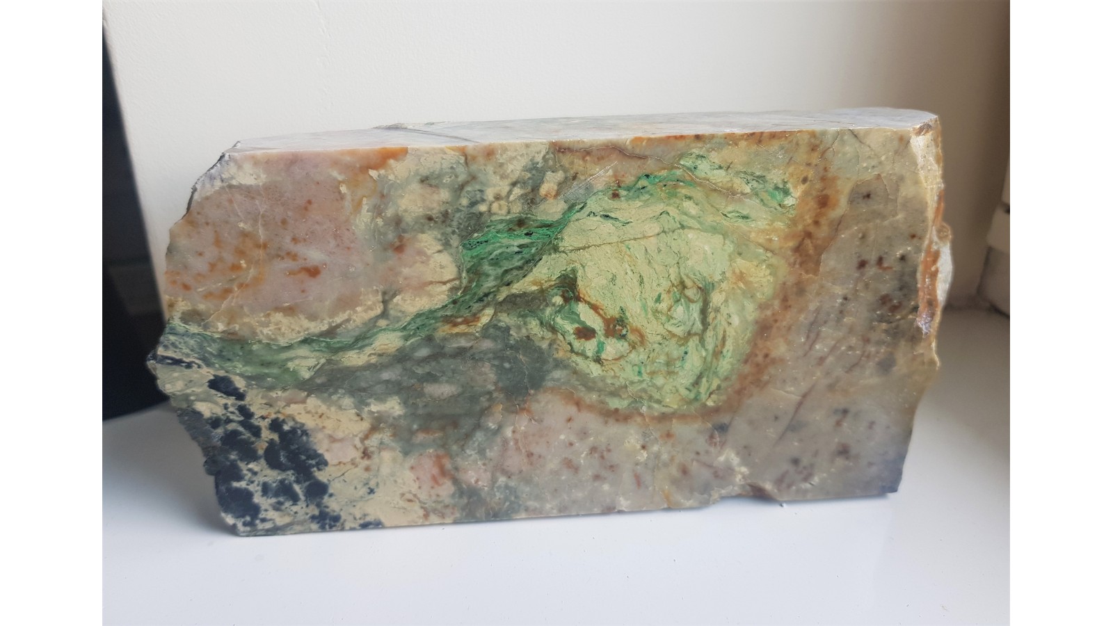 Polerowany bloczek rodingitu ze smugą szmaragdowozielonych granatów chromowych z centrami w postaci spineli chromowych o metalicznym połysku. Okaz bardzo ciekawy mineralogicznie oraz barwny. Piękny, zawiły deseń będący pochodną tzw. dynamometamorfizmu (tzn. metamorfizmu kontaktowego powiązanego z oddziaływaniem ciśnień kierunkowych). Okaz polerowany jednostronnie, druga strona po cięciu. Okaz bardzo ustawny i łatwy do wyeksponowania. Okaz solidny, duży, masywny. Rzadkość mineralogiczna z kamieniołomu nefrytu w Jordanowie Śląskim z dawnych lat. Polecam.