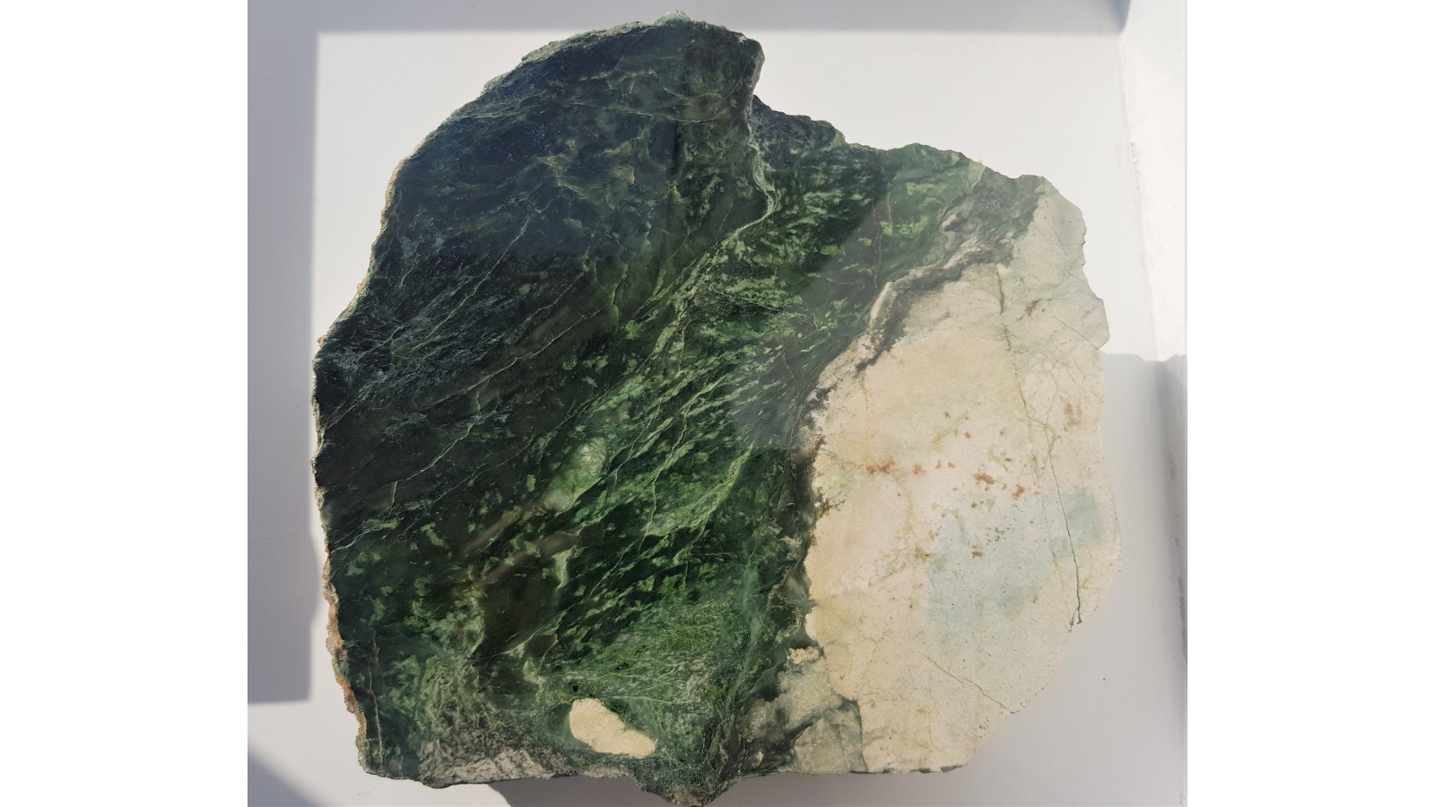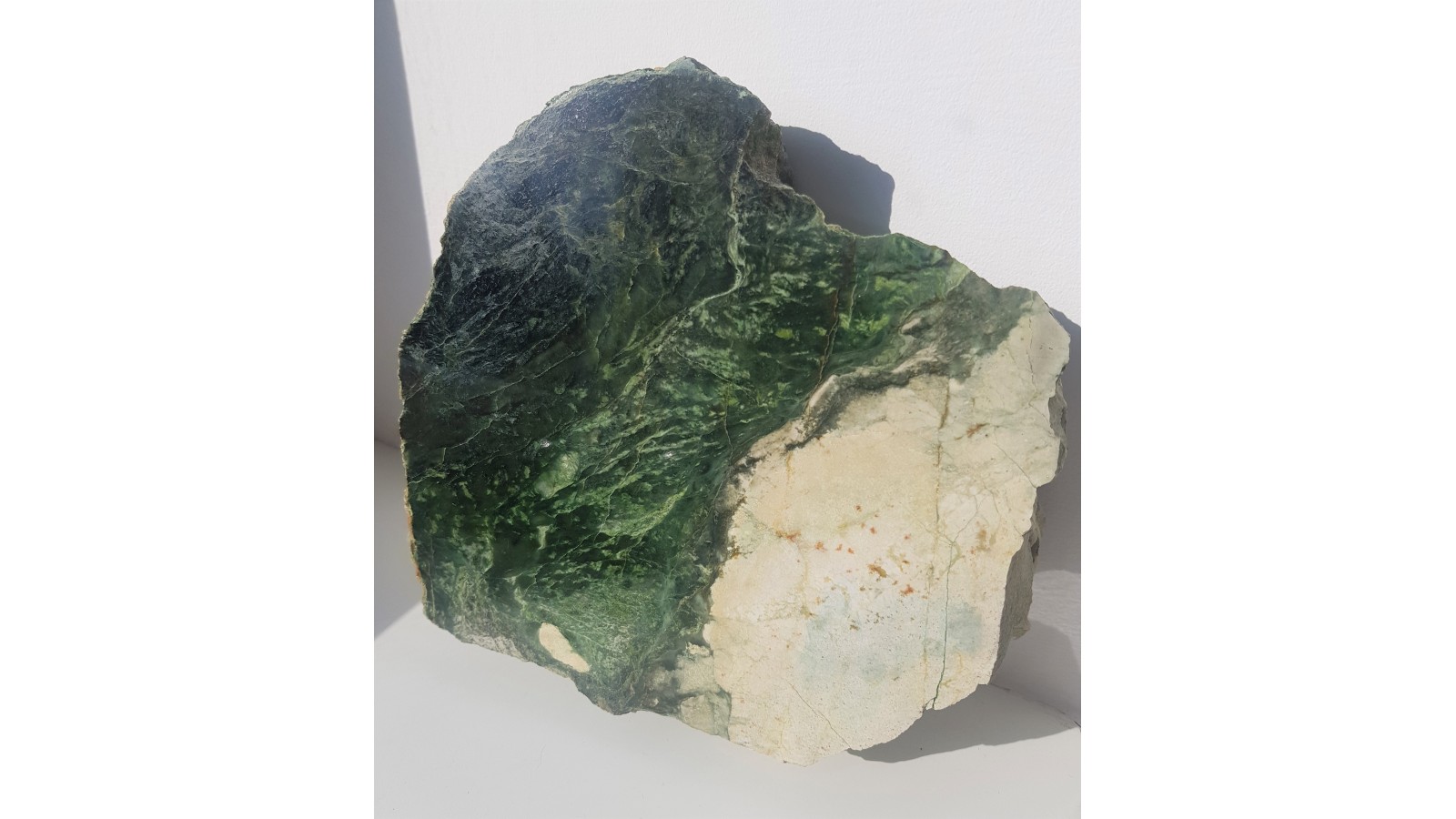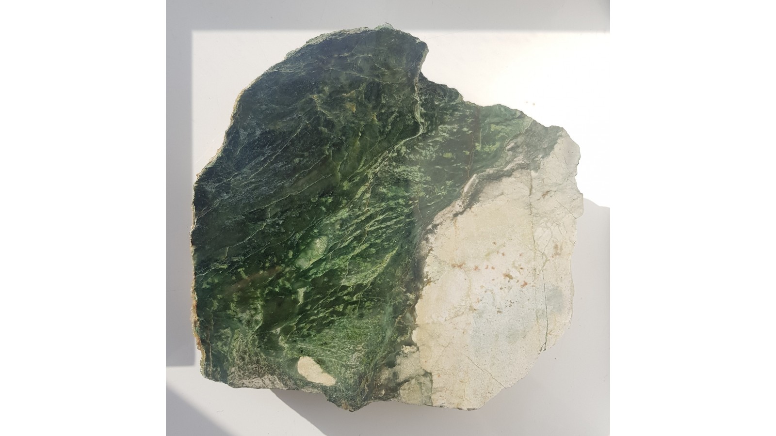 Duża płyta nefrytu na kontakcie z jasnym, masywnym rodingitem. Nefryt wysokiej jakości, świeży, o głębokiej zielonej barwie. Okaz dokumentuje proces powstawania nefrytów z Jordanowa Śląskiego, związany z intrudowaniem skał będących końcowym produktem ewolucji magm gabrowych oraz towarzyszacym mu dynamometamorfizmem. Idealny poler, duża płyta, strona przeciwna po cięciu, gruba płyta. Nefryt niespękany, piękny kolor. Polecam jako okaz geologiczny i mineralogiczny.