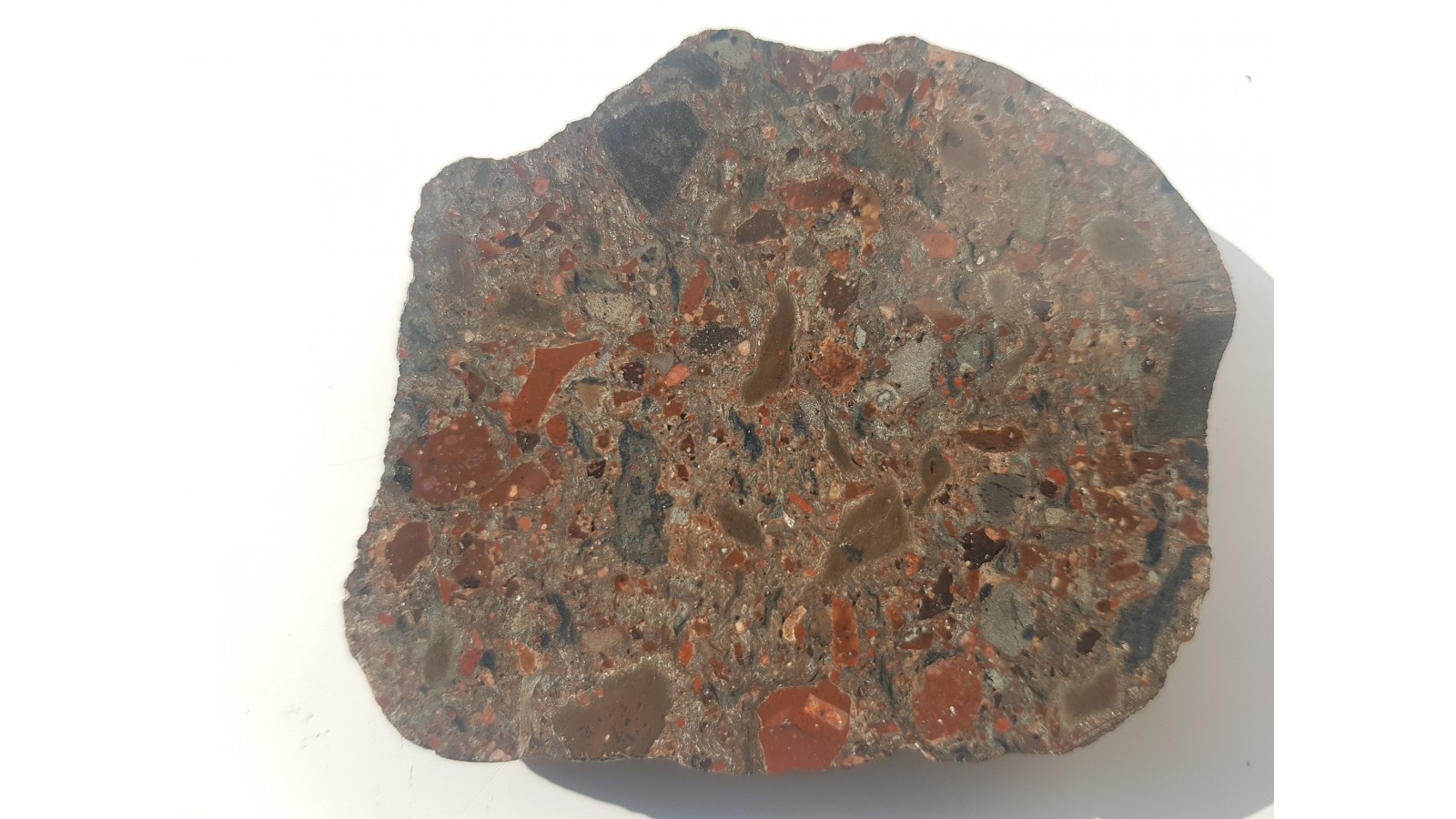Niezwykła brekcja wulkaniczna, barwna, wyjątkowa tekstura skały i deseń. Eratyk, pobrzeże Bałtyku - Orzechowo. Idealny poler, strona przeciwna naturalna - otoczak. Okaz niespękany bez śladów nadwietrzenia. Polecam.