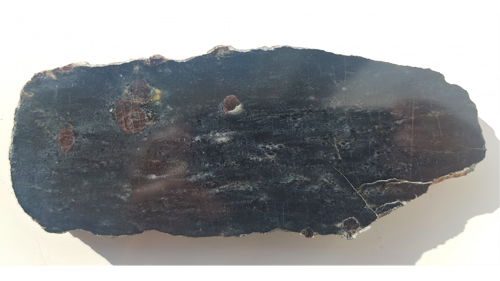 Polerowany okaz hornfelsu z Żelazna k. Kłodzka z dużymi porfiroblastami granatów a także błękitnym korundem (szafirem) widocznym pod lupą. Ciemna skała, bardzo masywna i lita. Powstała na kontakcie z granitoidami strefy kłodzko-złotostockiej. Skały te były opisywane w literaturze geologicznej i wzmiankowano w nich zarówno obecność korundu jak i hercynitu, który w próbce jest niewidoczny. Skała dla znawców i pasjonatów rzadkości z Sudetów. Piękny poler, strona przeciwna po pile.