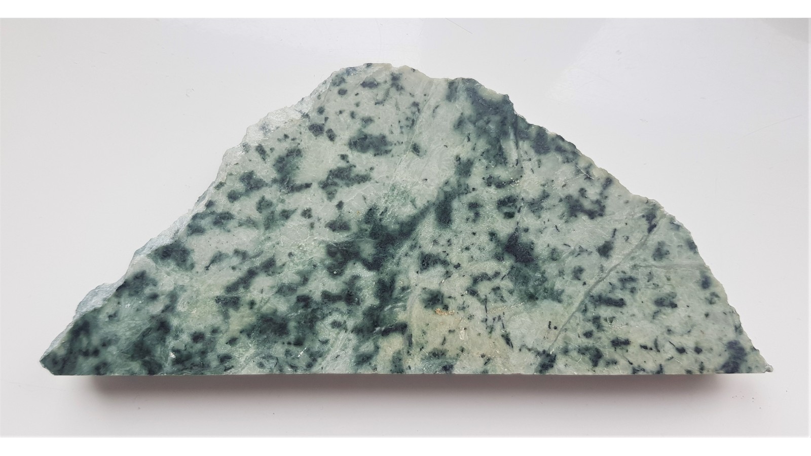 Biała odmiana żmijowca z kamieniołomu w Nasłwicach. Zdecydowanie rzadsza niż serpentynity zielone. Okaz polerowany jednostronnie, strona przeciwna po cięciu piłą. Polecam.