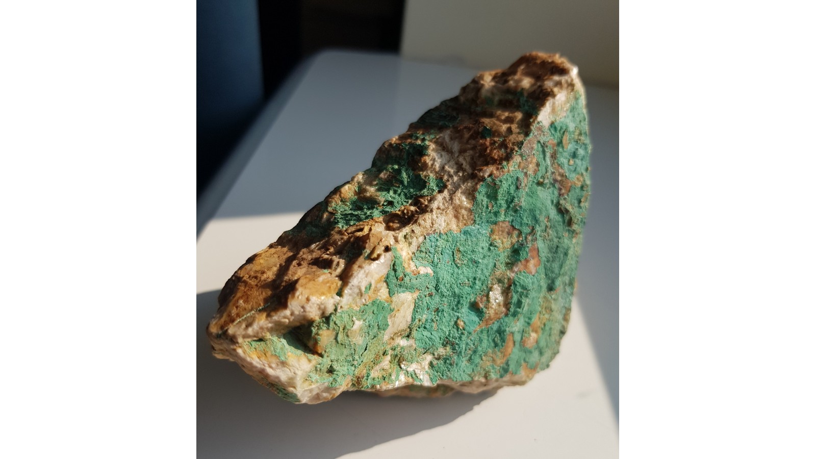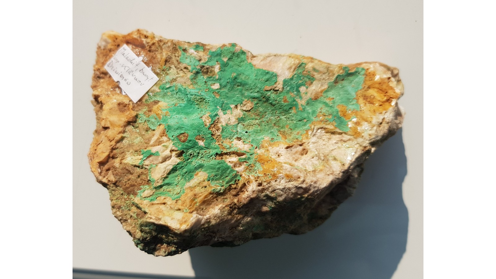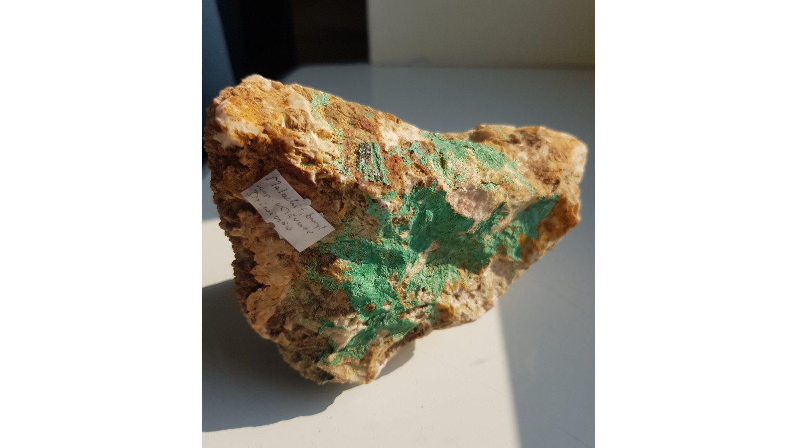 Pokaźny fragment żyły barytowej pokryty obfitym malachitem niemal z każdej strony. Okaz z historycznej, nieznanej szerzej kopalni Klaerner w Dziwiszowie k. Jeleniej Góry. Okazy nieobecne na rynku, sprzed wielu lat. Polecam.