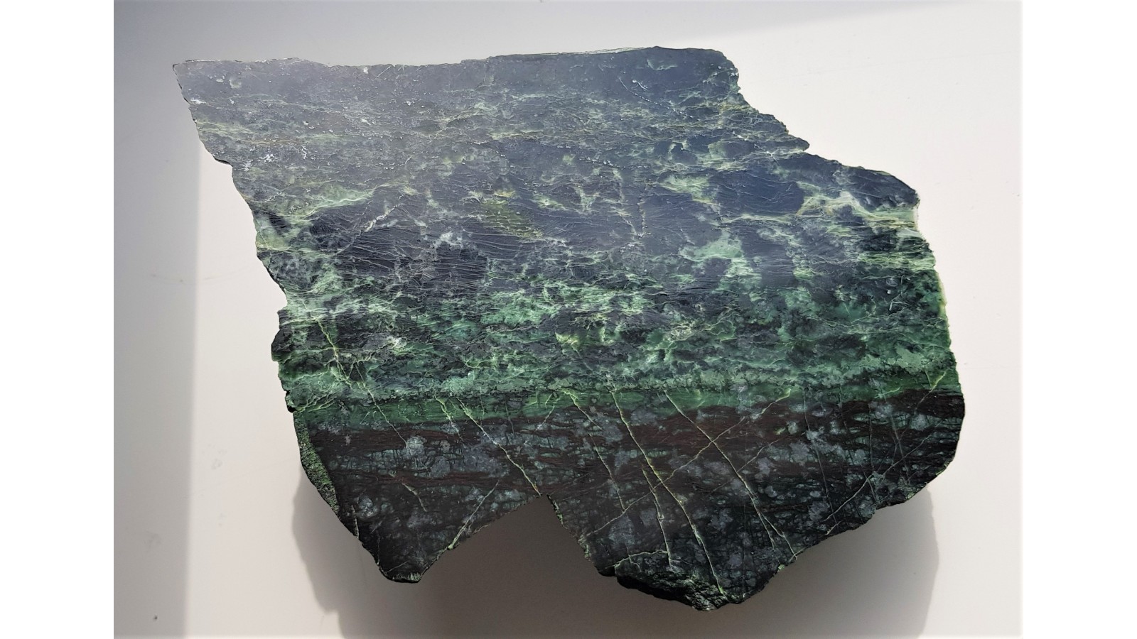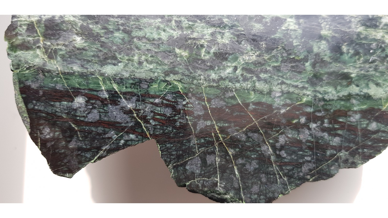 Serpentynit ze Słupic, Wzgórza Oleszeńskie stanowiący fragment żyłowego utworu stanowiącego jednocześnie strefę karbonatyzacji, tzn. wzbogacenia w minerały węglanowe, takie jak dolomit czy kalcyt. Przy rozkładzie pierwotnych oliwinow i piroksenów dochodziło do tworzenia zarówno minerałów z grupy serpentynu jak i węglanów czy widocznego w próbce magnetytu. Najciekawsza jest strefa czerwona widoczna na zdjęciu związana zapewne również z przemianami w formie lokalnej karbonatyzacji, jak i relikty piroksenów. Strefa w formie wyraźnej żyły, która była strefą tektoniczną umożliwiającą migrację roztworów termalnych. Okaz polerowany jednostronnie. Rzadkość z uwagi na lokalnie czeroną barwę serpentynitu oraz wodoczne pierwotne tekstury skały magmowej. Polecam.
