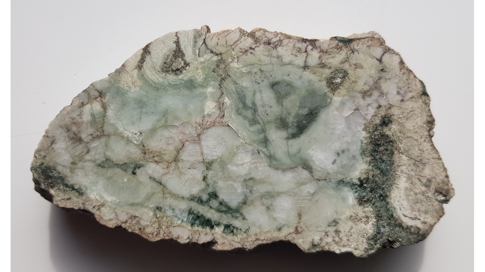 Niezwykła skała z owalnymi strukturami z Czarnowa k. Kamiennej Góry. Skarn zawierający minerały węglanowe oraz prawdopodobnie diopsyd oraz amfibole. Ciekawa barwa, błękitnawo-seledynowa. Owalne struktury przypominają te znane ze skarnów z Dalniegorska. Jednostronny poler, strona przeciwna po pile, regularna płyta. Polecam.