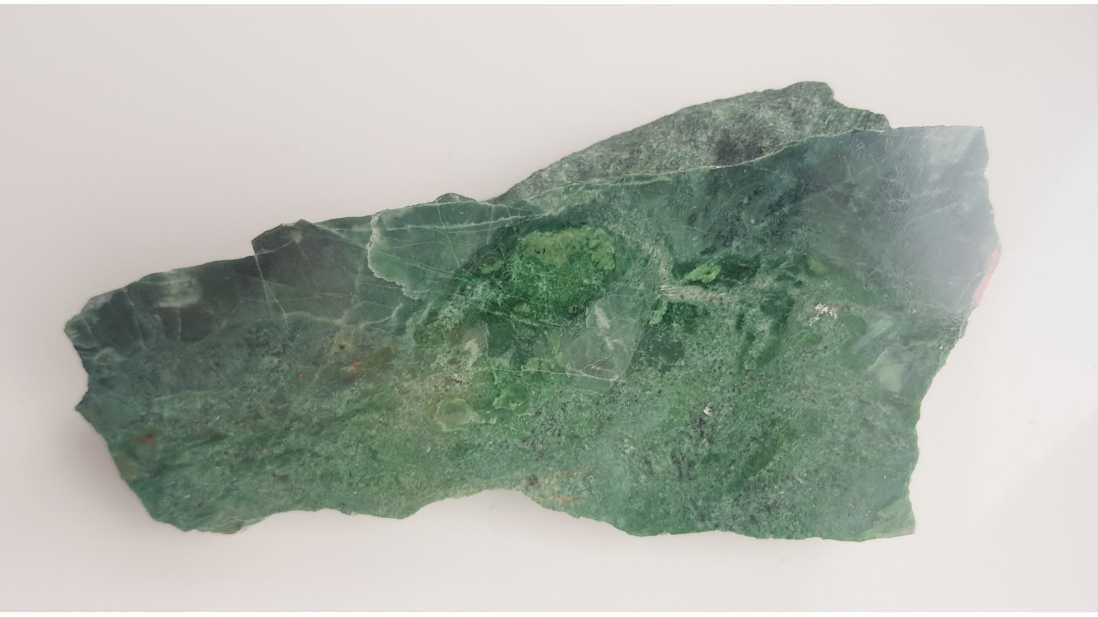 Polerowany okaz prawdziwego jadeitu, pięknie lokalnie zabarwiony na szmaragdowozielony kolor. Okaz z Masywu Monviso we włoskich Alpach, w którym odsłaniają się skały ofiolitu, pośród których unikatowe jest wystąpienie jadeitytów. Unikat. Strona przeciwa naturalna. Polecam.