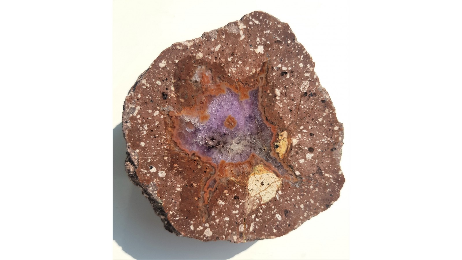 Niespękany okaz ametystu w agacie z Nowego Kościoła w Górach Kaczawskich. Duży, bardzo estetyczny okaz. Ametyst mocno wybarwiony, bez jakichkolwiek uszkodzeń. Polecam.