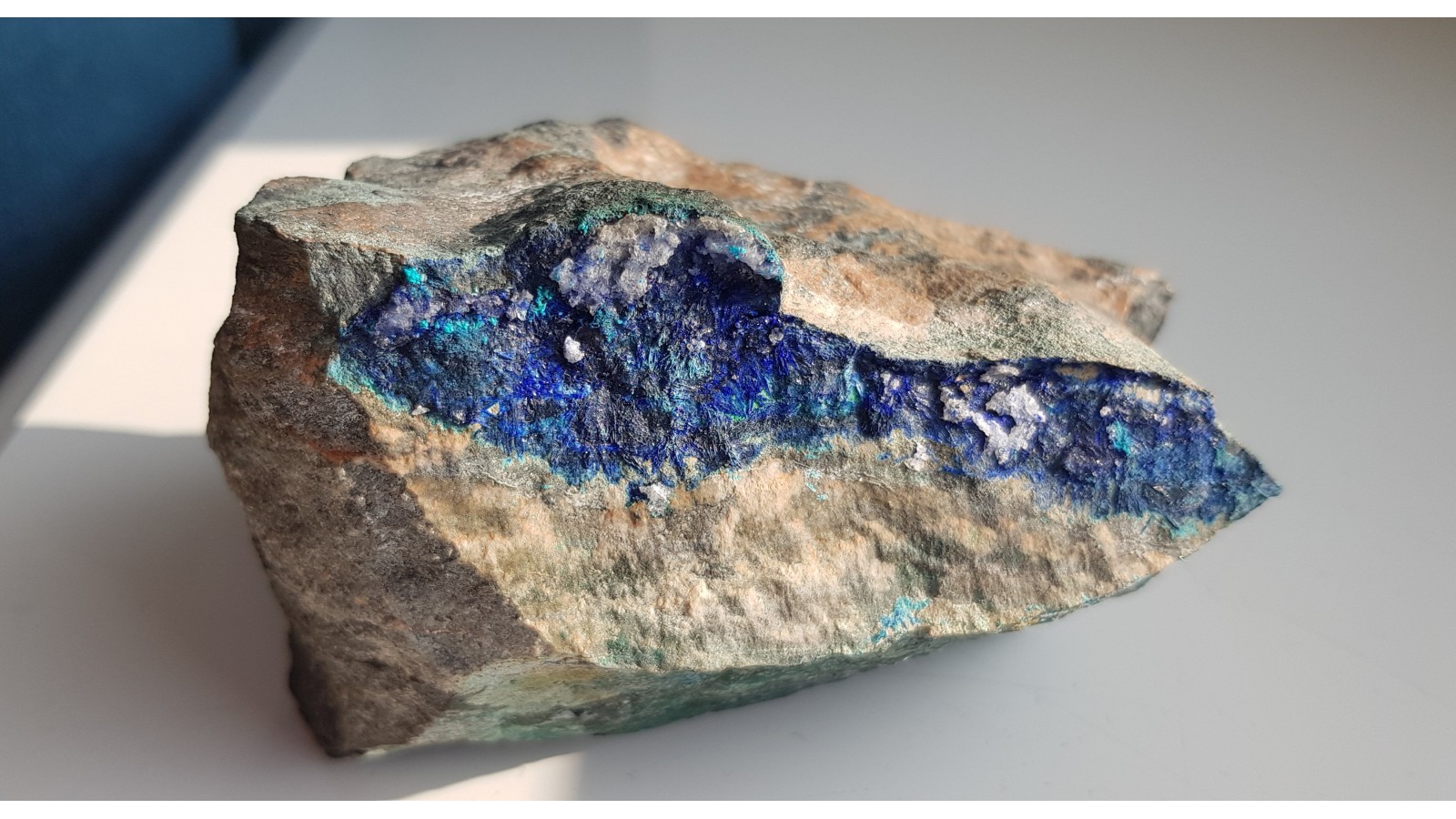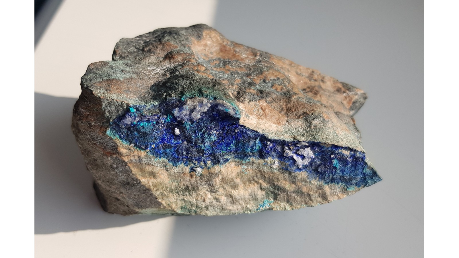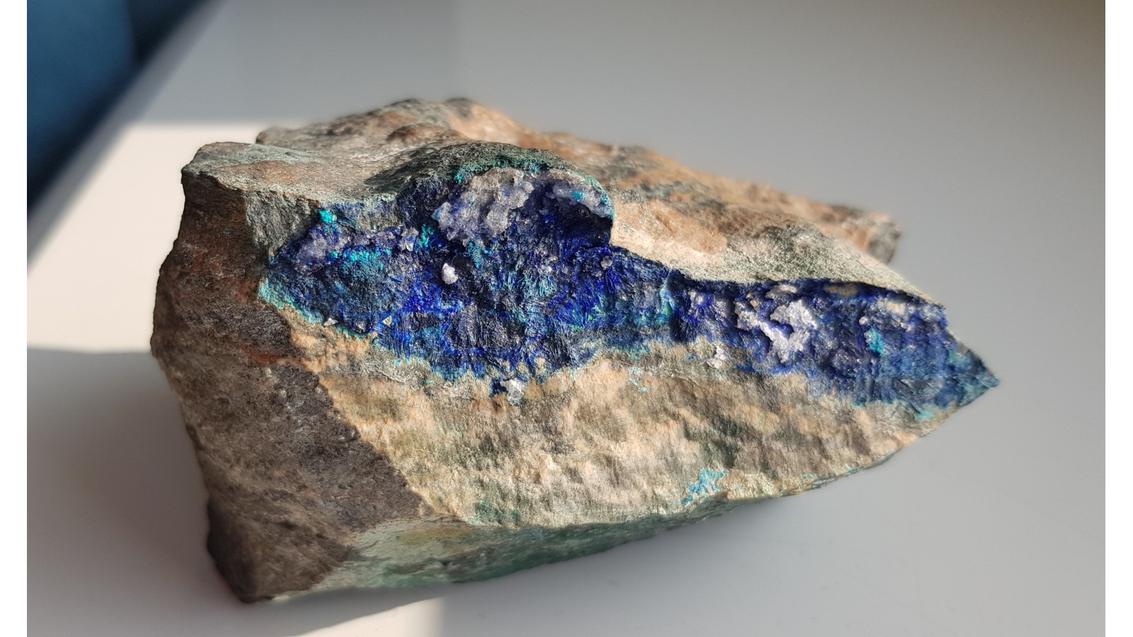 Niezwykle rzadkie w złożu rud miedzi na monoklinie przedsudeckiej kryształy azurytu na piaskowcu zmineralizowanym chalkozynem. Piękny okaz kolekcjonerski, prawdziwa rzadkość. Wszystko masywne, bez spękań i uszkodzeń. Polecam.
