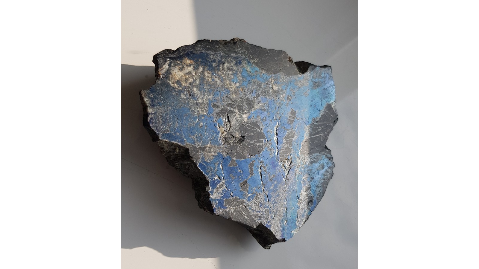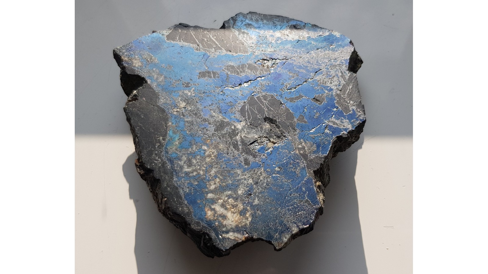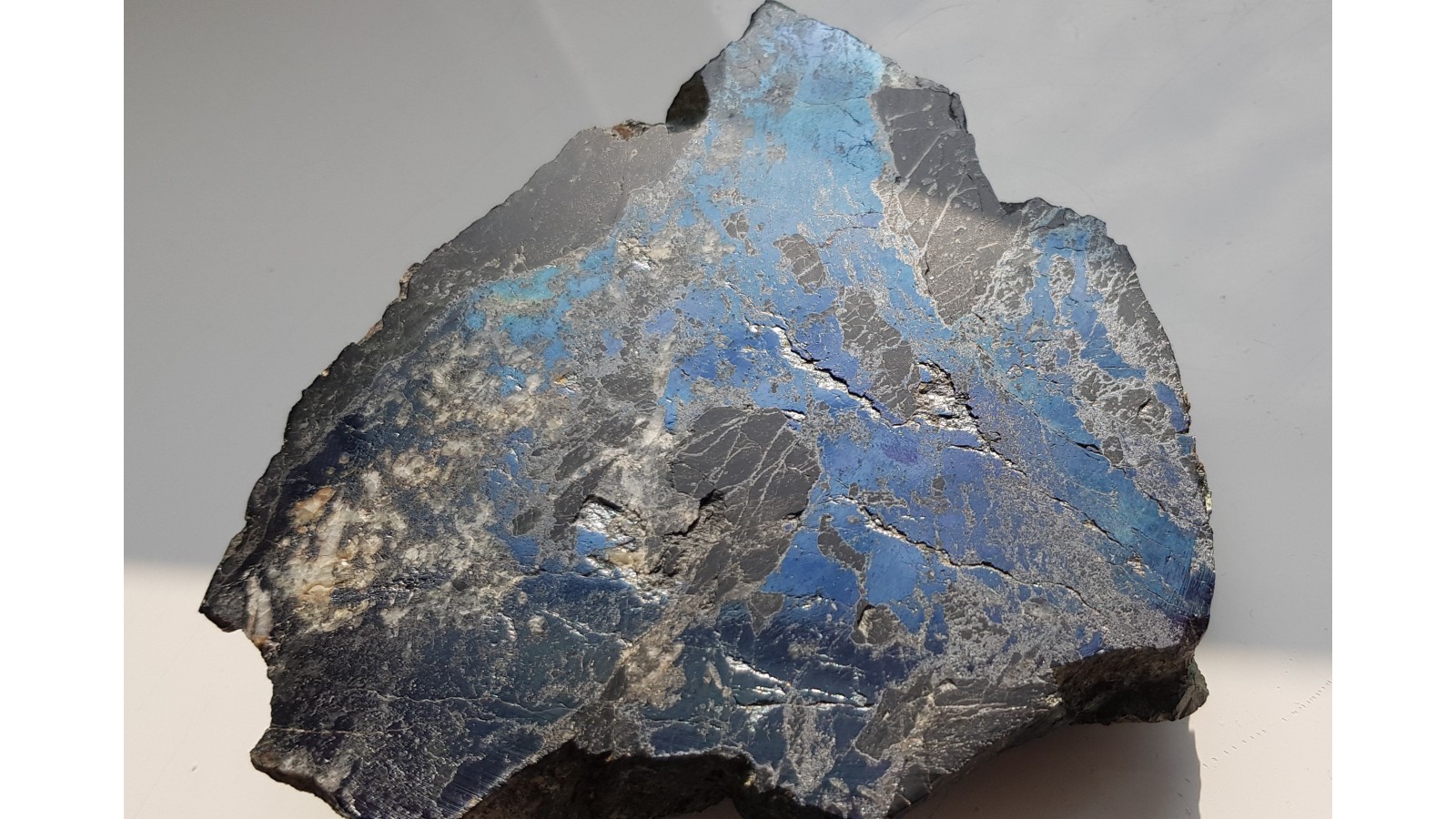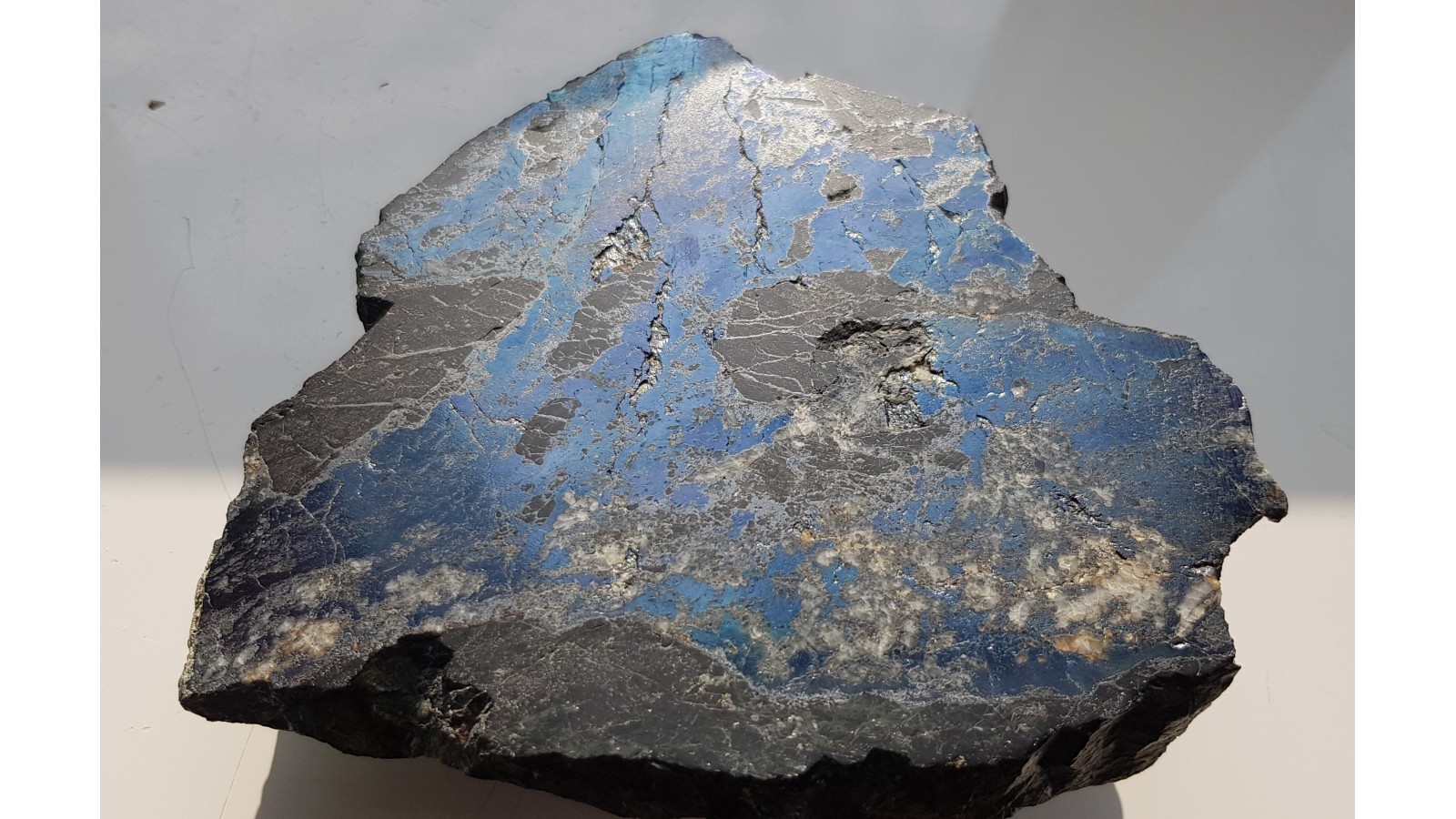 Duży, muzealny okaz bornitu z hałdy dawnej kopalni rud miedzi w Orlinku-Ciechanowicach k. Miedzianki sudeckiej. Okaz polerowany, duży fragment ze skałą otaczającą - łupkiem amfibolowym z żyły Srebrny Książę znenej z występowania srebra rodzimego. Naloty malachitu po stronie przeciwnej, naturalnej. Na zgładzie masywny bornit, niewiele skały otaczającej oraz jasne strefy barytowe. Bardzo estetyczny, duży okaz nadający się do każdej ekspozycji minerałów sudeckich. Okaz z dawnych czasów, wyjątkowy. Polecam.
