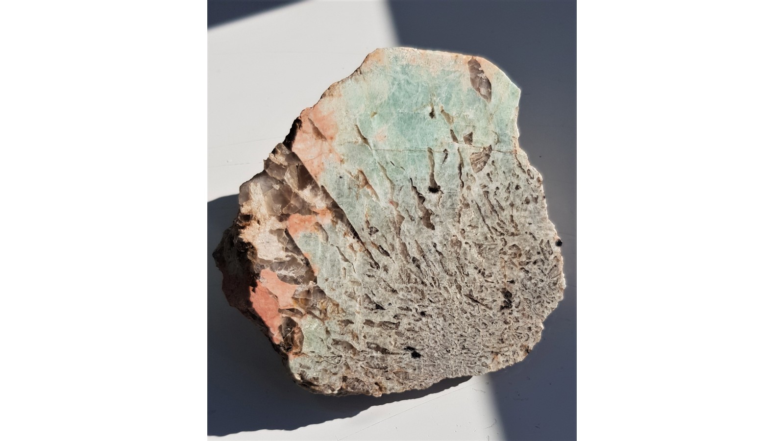 Okaz kamienia hebrajskiego z Bukowca k. Jeleniej Góry. Okaz o wyjątkowym, wyrazistym zielonym oraz różowym kolorze oraz bardzo czytelnej strukturze napisowej. Okaz polerowany jednostronnie, strona przeciwna naturalna. Okaz bardzo estetyczny, masywny, niespękany. Polecam.