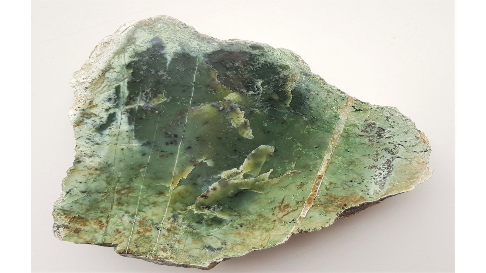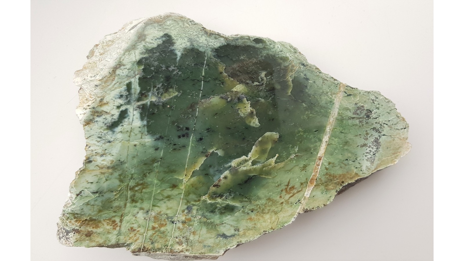 Polerowany okaz nefrytu z Jordanowa Śląskiego. Duży okaz, świetny poler, strona przeciwna naturalna, bez cięcia. Dosyć jasna barwa i spora przejrzystość, jak na nefryt z Jordanowa. Dobry okaz. Polecam.