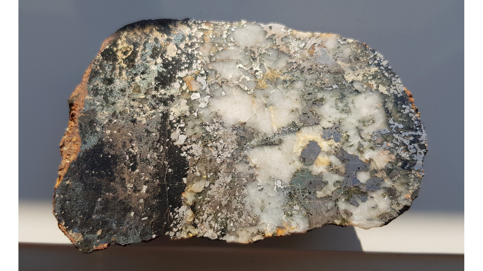 Parageneza minerałów rudnych - głównie arsenopirytu, pirytu, pirotynu, bornitu oraz zapewne innych nierozpoznanych minerałów rudnych z dawnej kopalni rud Evelinensgluck w Czarnowie k. Kamiennej Góry. Obfita mineralizacja rudna w żyle kwarcowej. Okaz polerowany jednostronnie. Strona przeciwna naturalna, nie cięta. Polecam.