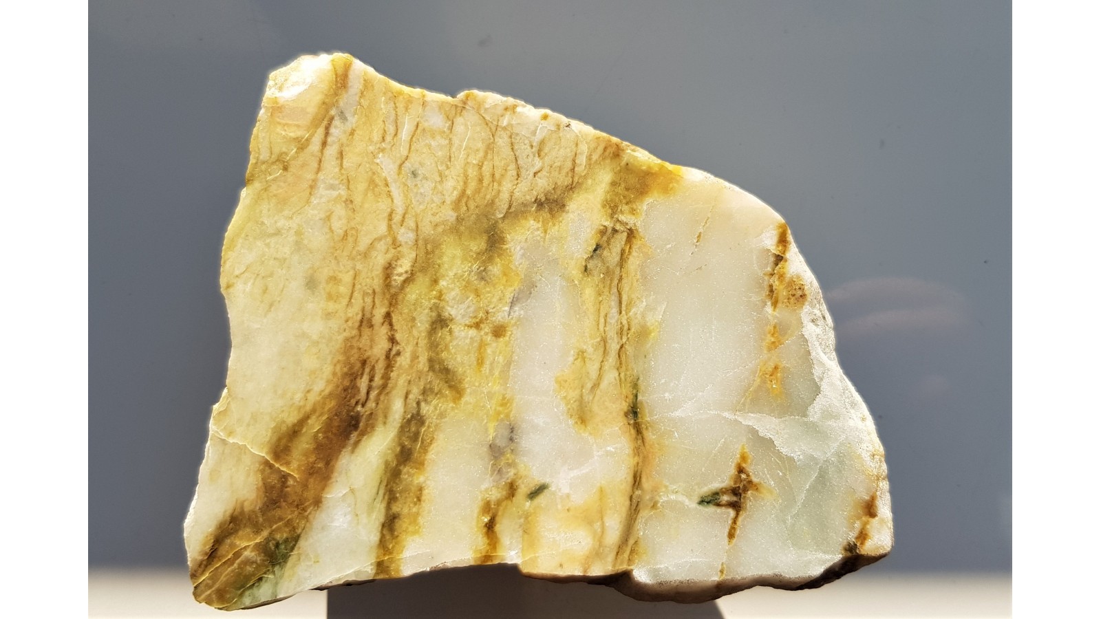 Biało-żółty dolomit z Rędzin k. Kamiennej Góry. Okaz polerowany jednostronnie, strona przeciwna naturalna, nie cięta. Żółte minerały to minerały z grupy serpentynu. Polecam.