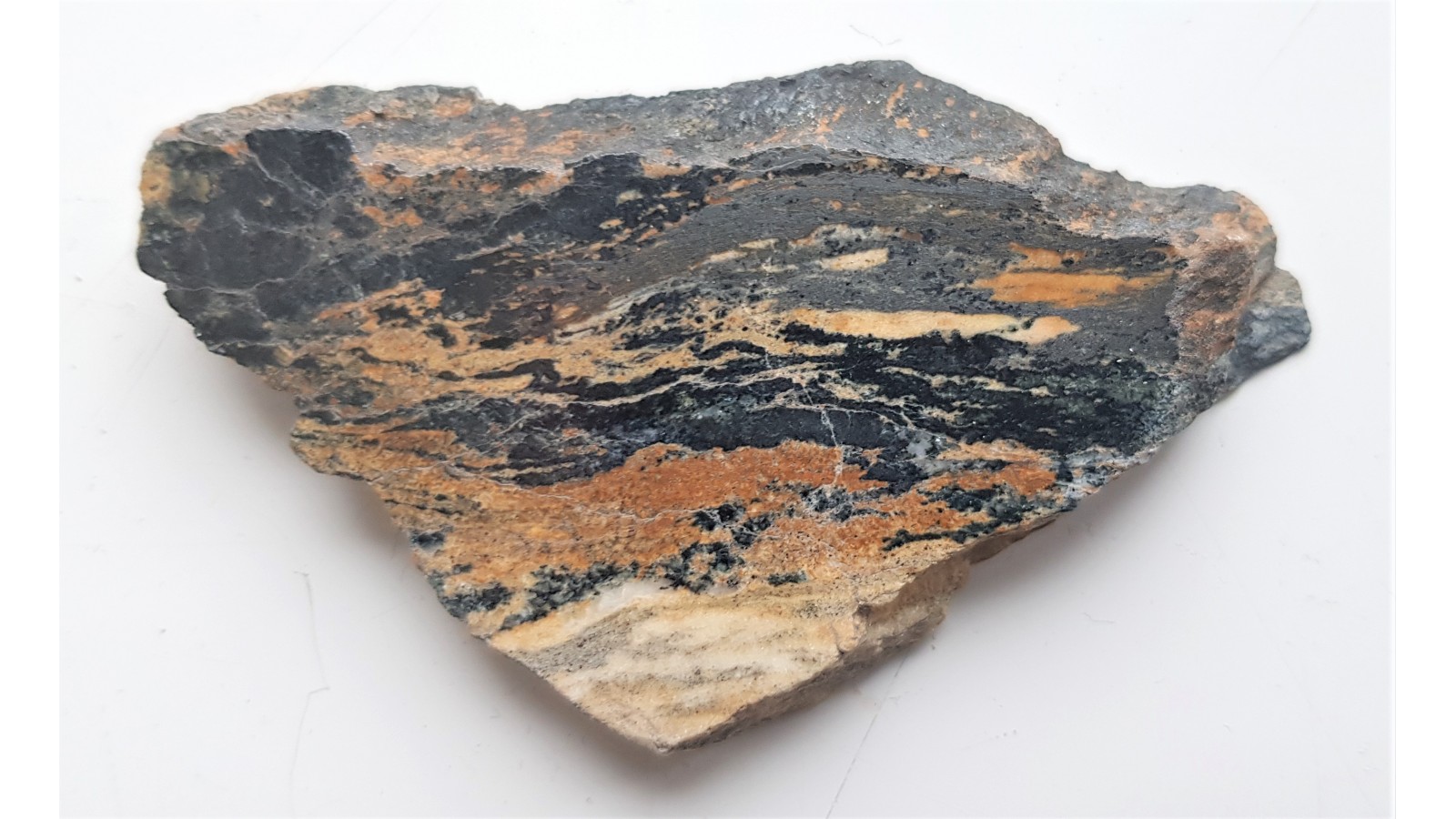 Nietypowa pozycja turmalinu razem z hematytem w marmurze z Góry Krzyżnik k. Stronia Śląskiego w pobiżu kontaktu z łupkami łyszczykowymi. Osobniki turmalinu wykazują przy intensywnym oświetleniu barwę ciemniniebieską. Ciekawostka mineralogiczna. Okaz polerowany dwustronnie. Polecam.