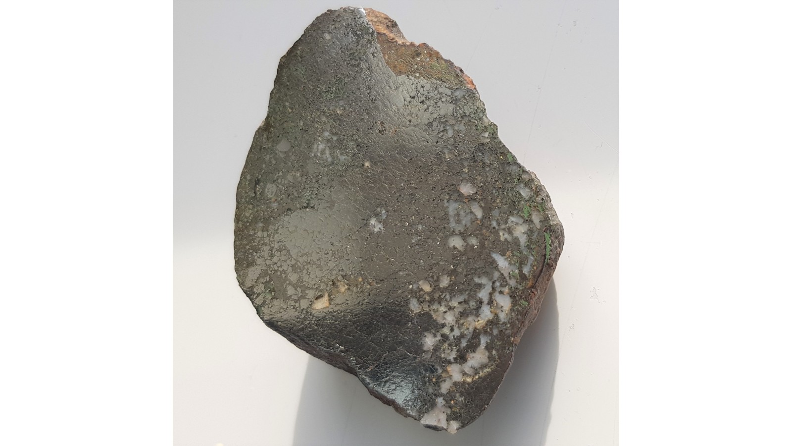 Bryłka masywnego arsenopirytu z dawnej kopalni rud Evelinensgluck w Czarnowie k. Kamiennej Góry. Obfita mineralizacja w żyle kwarcowej. Okaz polerowany jednostronnie. Strona przeciwna naturalna, nie cięta. Polecam.