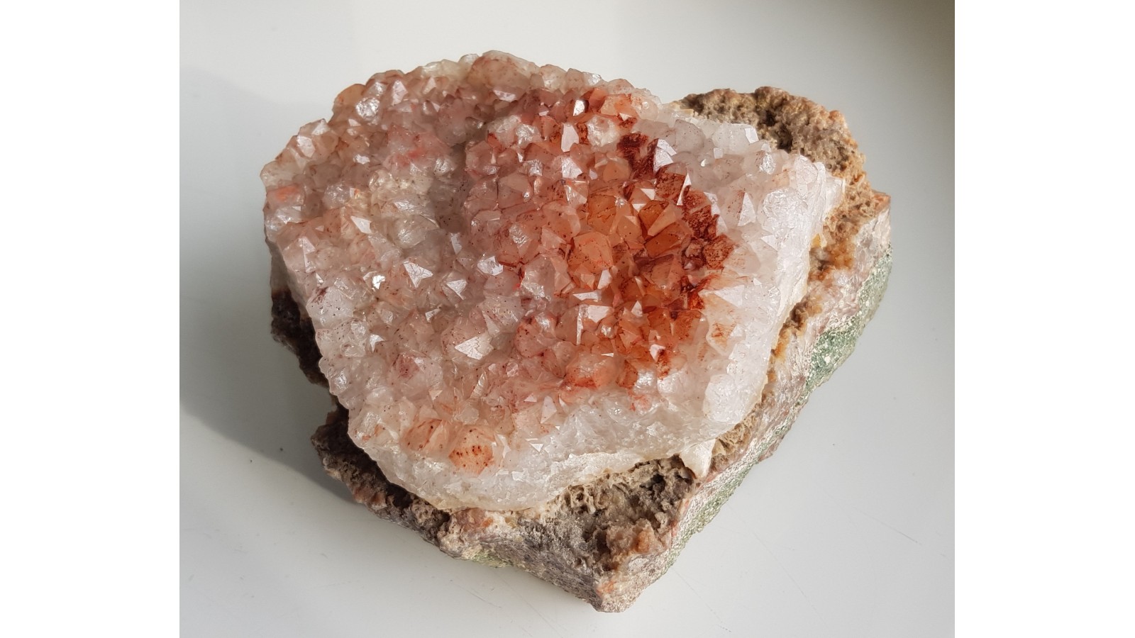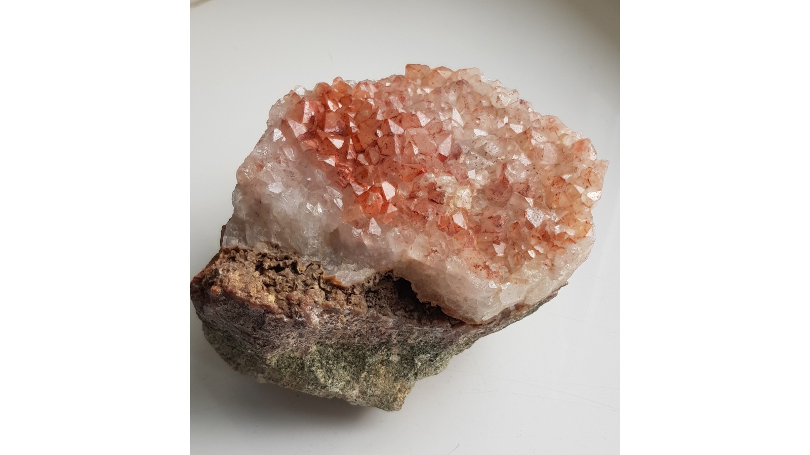 Piękna, duża szczotka kwarcowa pokryta śmietaną hematytową z Gozdna. Druza bez istotnych uszkodzeń obniżających estetykę. Szczotka na masywnym, zielonym porfirze. Rzadka lokalizacja. Okaz sprzed wielu lat. Polecam.