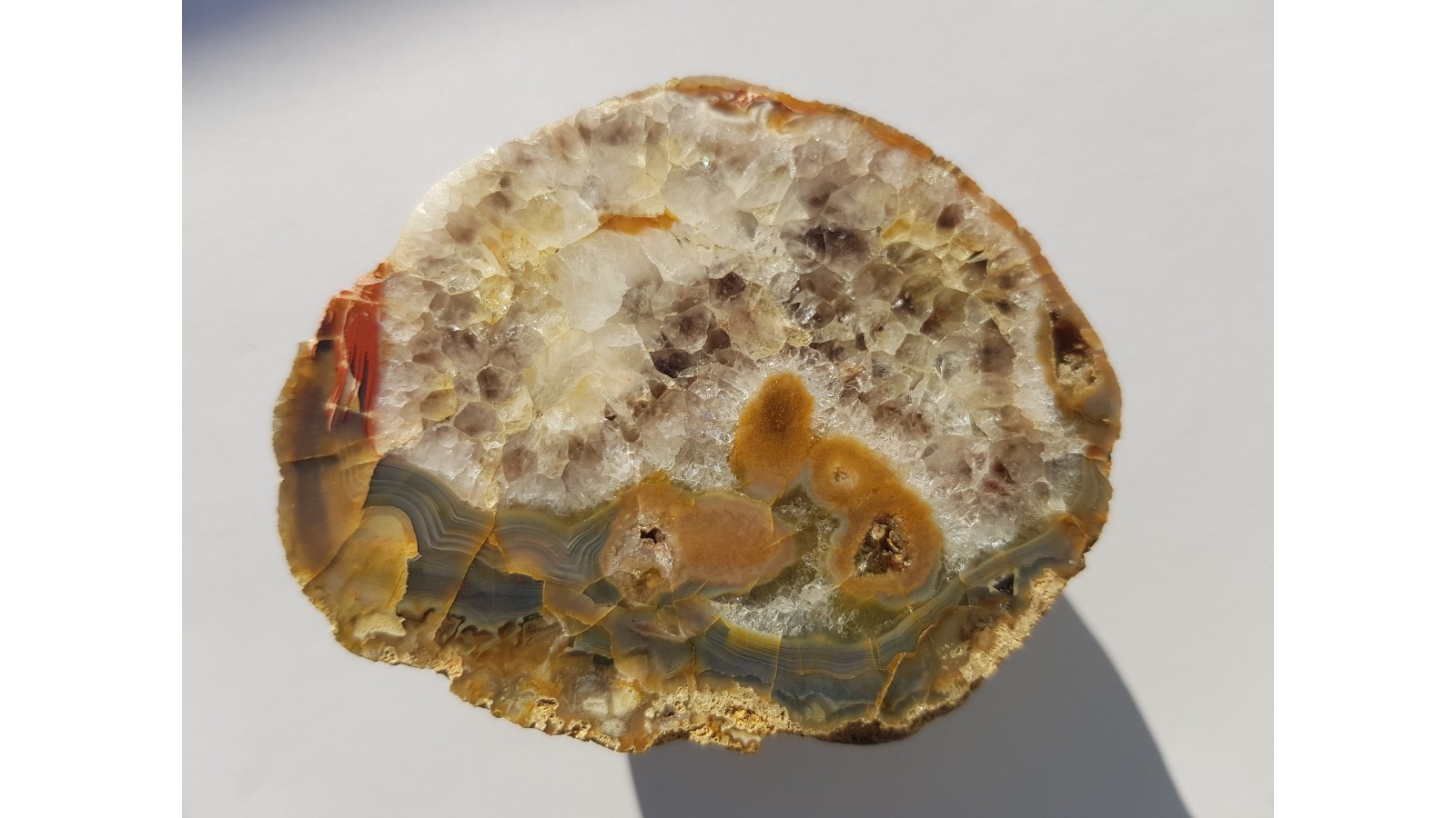 Agat z aluwiów rzeki Ścinawki. Duża strefa kwarcowa z kwarcem zadymionym oraz barwny agat. Strona przeciwna naturalna. Rzadka lokalizacja - żwirownia Bierkowice. Polecam.