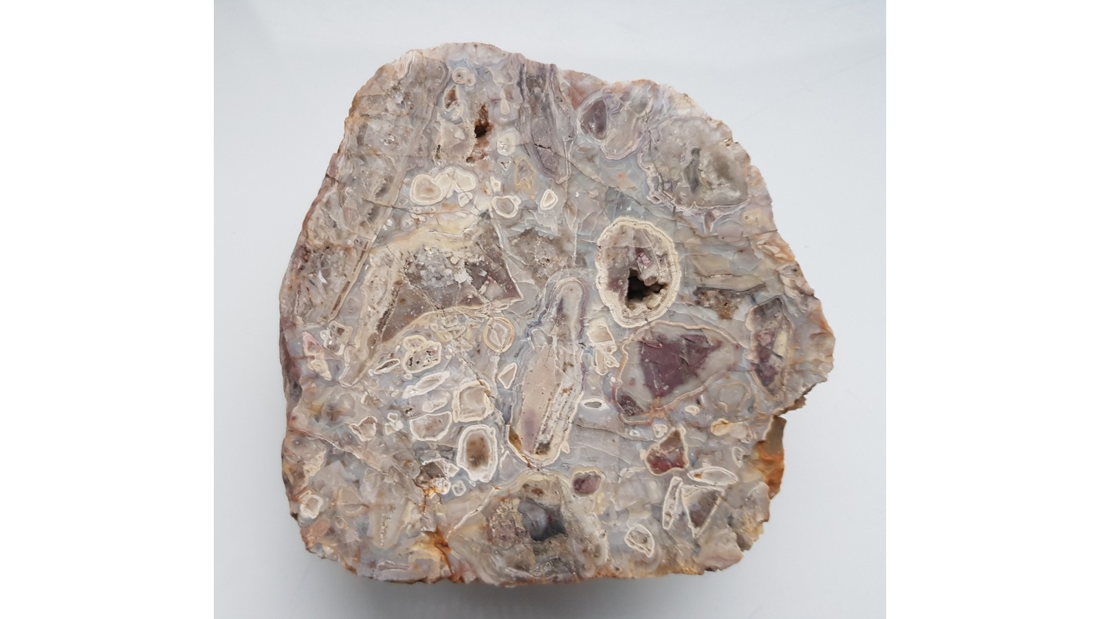 Ciekawa skała chalcedonowo-agatowa z Sokoli k. Bolkowa. W skale widoczne strefy agatowe oraz tło chalcedonowe. Poler z jednej strony, strona przeciwna - naturalny otoczak. Całość w różnych odcieniach bieli, szarości, beżu. Wyrazisty, kontrastowy deseń. Polecam.