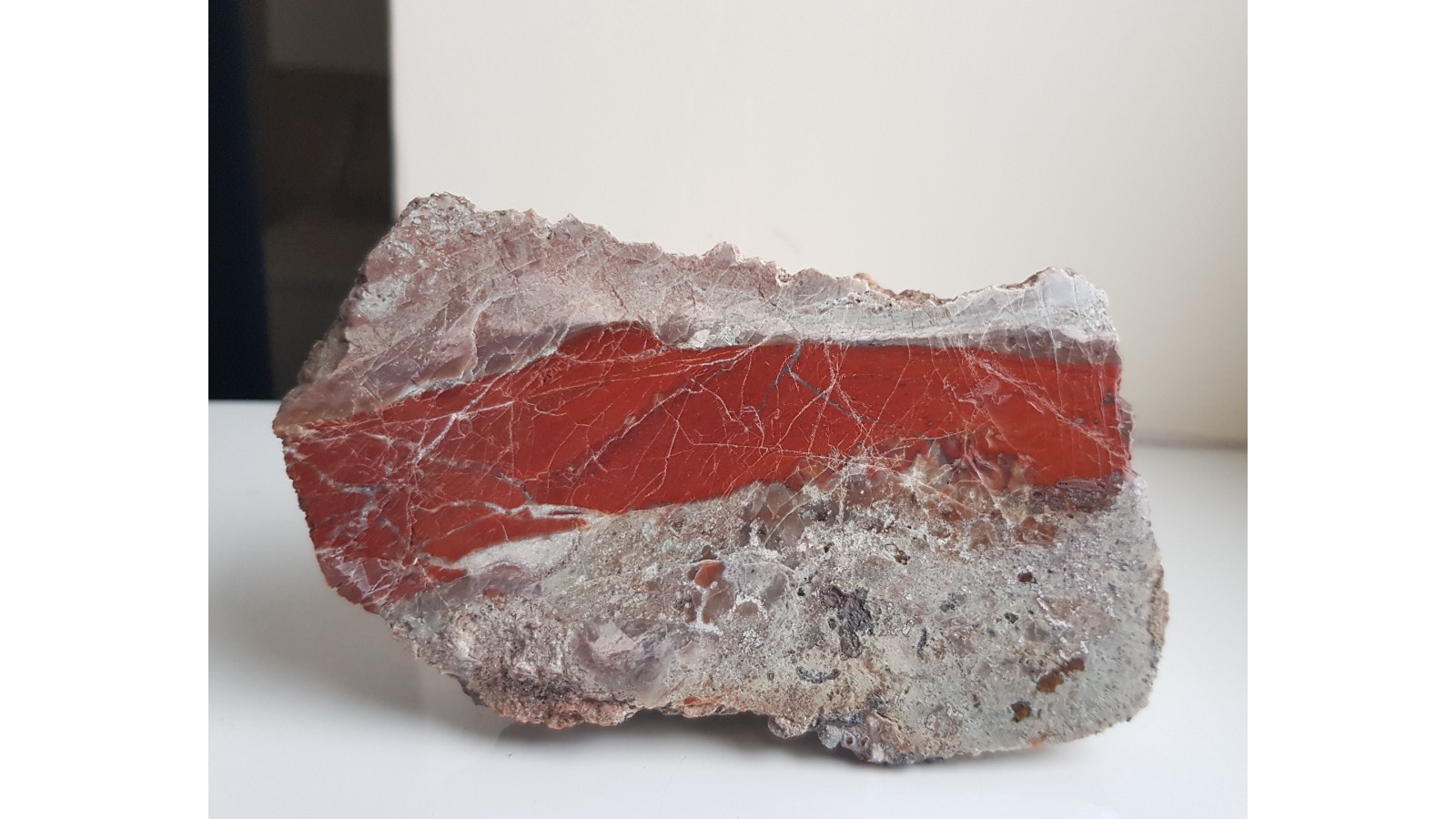 Jaspis w jasnej otoczce ze stanowiska Skałka Melafirowa we Wleniu. Rzadko obecna na rynku lokalizacja. Jaspis z deseniem pejzażowym. Strona przeciwna naturalna, nie cięta. Polecam.