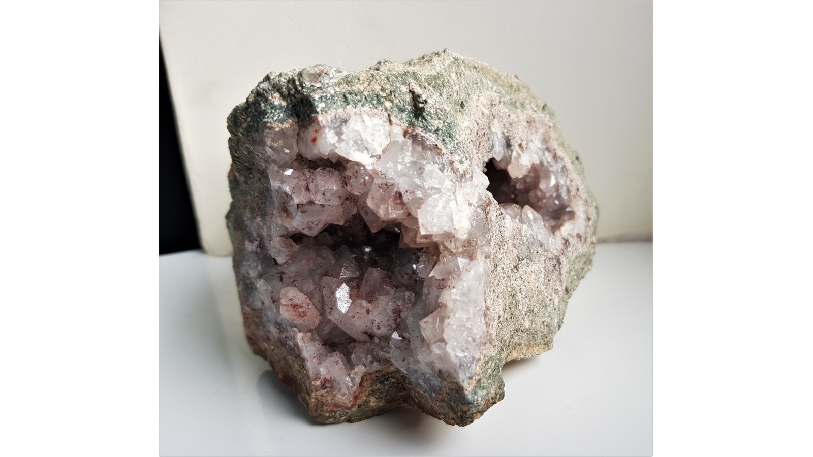 Geoda z kwarcem pokrytym lokalnie hematytem z Gozdna. Wyrazisty kształt buły, zielona barwa porfiru. Pokaźny okaz. Cały okaz naturalny, nie cięty ani nie szlifowany. Regularna powierzchnia geody. Polecam.